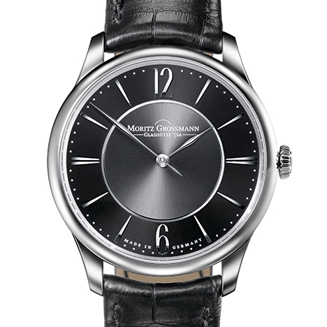 仕様:時、分、ストップセコンド、ロジウム仕上げダークグレーダイヤル、ステンレスのインデックス、自社製のスチール針(ポリッシュ仕上げ)