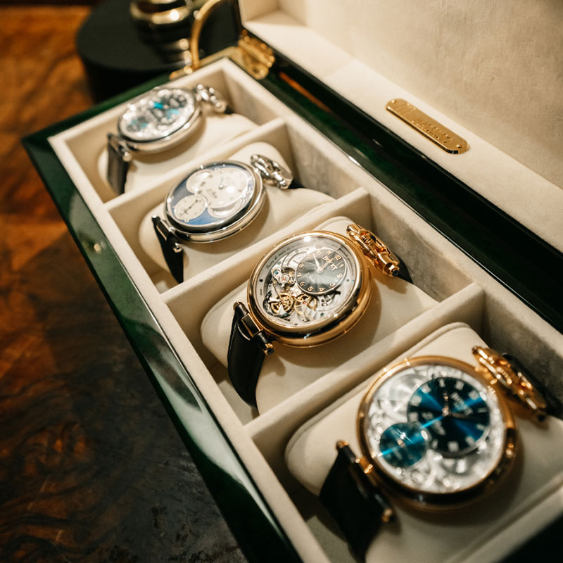「銀座松創」を設立したことで、顧客からの要望を受けて受注が増加した時計ケース。「松創」ではコレクションの保管だけでなく、自動巻きモデルの巻き上げも行えるワインダー装備の豪華な時計キャビネットなども製造している。
