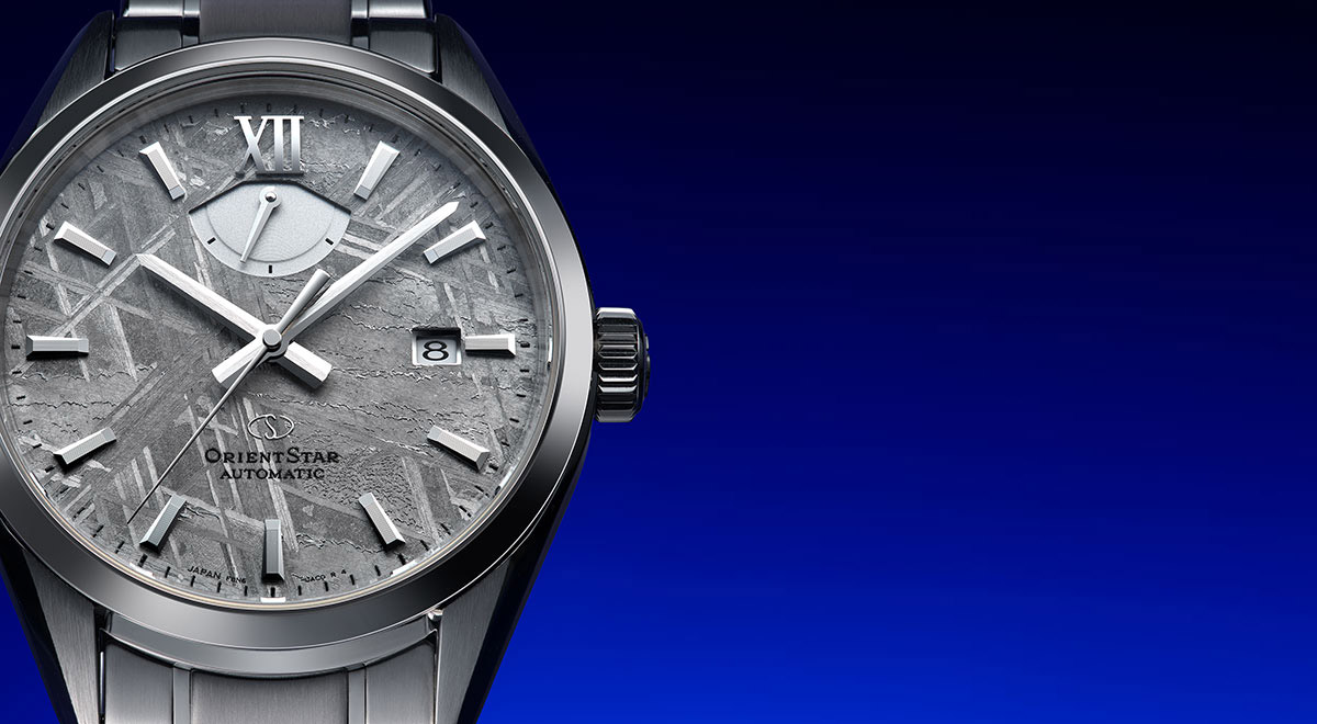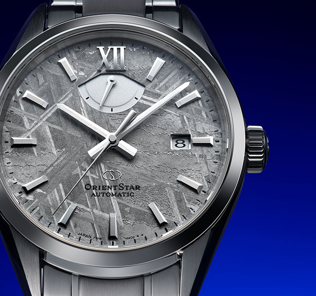 使われているのは、鉄隕石の一種で、約4.5億年前に形成されたとされるムオニオナルスタ隕石。ウィドマンシュテッテン構造と呼ばれる何本もの直線が不規則に走る結晶構造が特徴で、オリエントスターではこの隕石に銀色蒸着処理を施すことによって、独特の結晶模様を長年にわたって楽しめるようにしている。