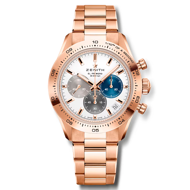 ホワイトの3色文字盤、ポンプ型のプッシュボタン、ゴールドブレスレットなど、伝統的なゼニスのクロノグラフの要素を現代的なフォルムのローズゴールドケースに組み込んだクロノマスター スポーツの新作。