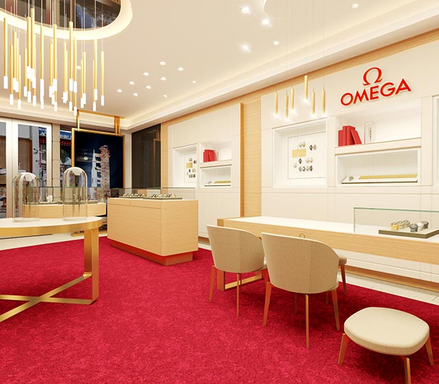 白を基調とした壁面と温かみのあるウッド素材、そしてオメガのブランドカラーである鮮やかなレッドカーペットがコントラストを成し、一歩足を踏み入れるだけでブランドの世界観に包み込まれるような、華やかで明るい空間が広がっています。