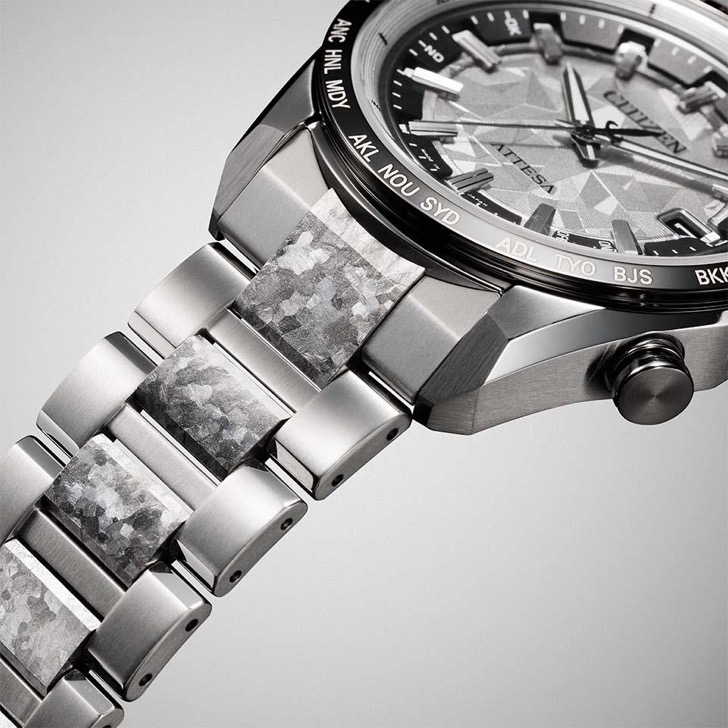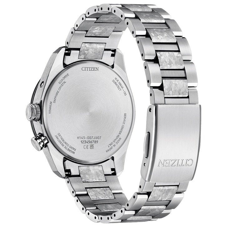 シチズン独自の技術で開発した結晶チタニウムを中駒に採用。デュラテクトプラチナを重ねることで結晶模様がプラチナの輝きをまとい、存在感を放ちます。