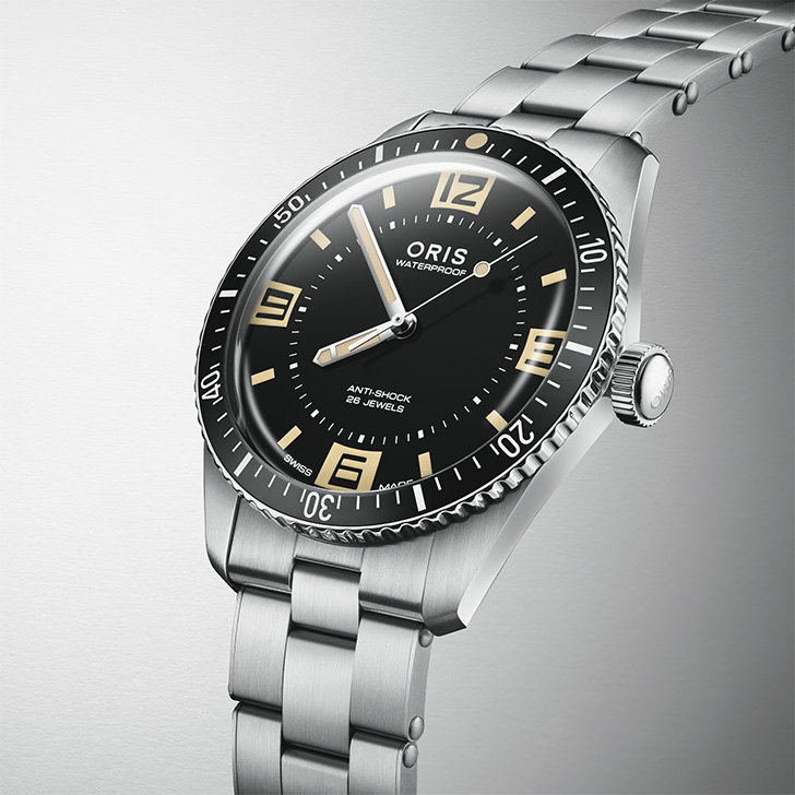 暗いところで光を放つ大胆なデザインの数字、ドーム型サファイアクリスタル、両回転ベゼルを配した、60周年を記念するアニバーサリーエディションです。オリスのロゴもレトロなデザインを復刻しました。