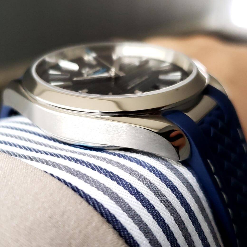 同色のライニングが施されたファブリック風のブルーのラバーストラップが付属。