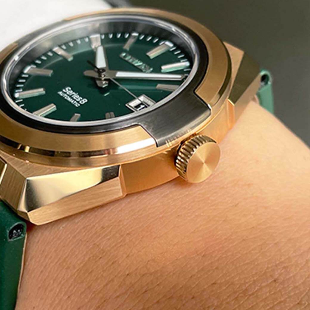 モダン・スポーティーデザインに、グリーンの文字板とバンド、ウォームゴールドのケースを組み合わせた力強くも鮮やかなモデルです。