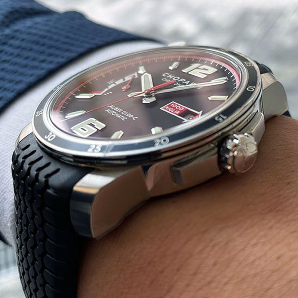 男心を擽るこのタイムピースは、ショパール自社製自動巻きキャリバー01.08-Cを搭載し、ラバーストラップおよび9時位置にパワーリザーブインジケーターを配した象徴的なブラックの文字盤が特徴。