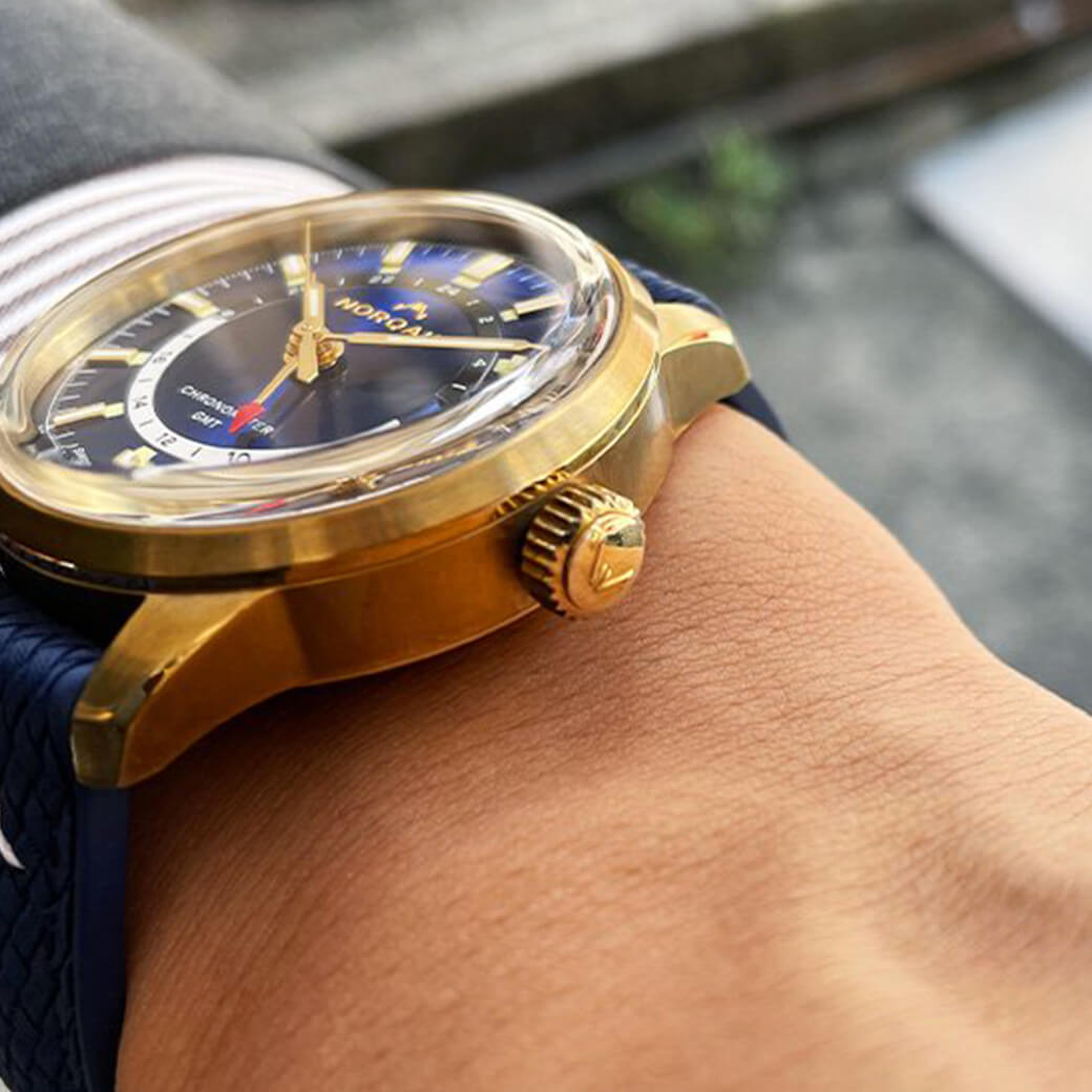 フリーダムコレクションのテーマは、大自然の中で自由を楽しむこと。新たにコレクションに加わったブロンズケース製GMT機構搭載のモデルは、ドーム型サファイアガラス、視認性の高い優雅な文字盤、ユニークな「NORQAINステッチ」を施したヴィンテージストラップを備えており、1960年代のスイス時計の美学を現代に蘇らせました。