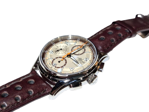 スーパールミノバを使用した文字盤インデックスは浮き上がるような立体感があり、暗い場所でも抜群の視認性があります。クリーム系のヴィンテージ色にストップウォッチ針のオレンジがセンスの良さを感じさせますね。
