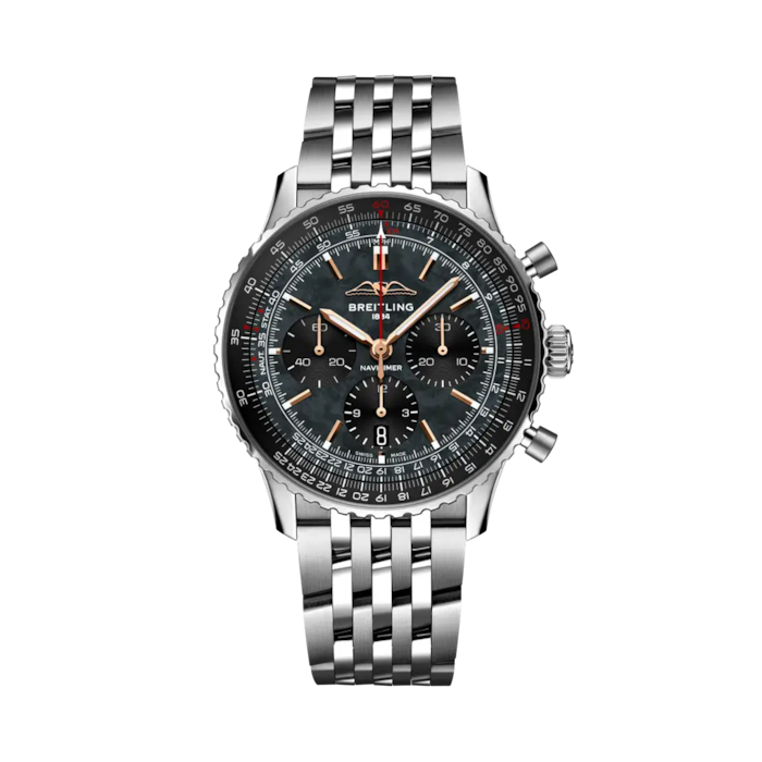 パイロットウォッチの金字塔「ナビタイマー」より、2025年の日本限定モデルが登場。 ブラック・マザーオブパールが、夜空の雲のような神秘的で深みのある煌めきを放ちます。 自社製ムーブメント「キャリバー01」を搭載し、裏蓋からその精緻な動きを鑑賞可能。 機能とスタイルを極めた歴史的モデルに、特別な美しさを宿した一本です。