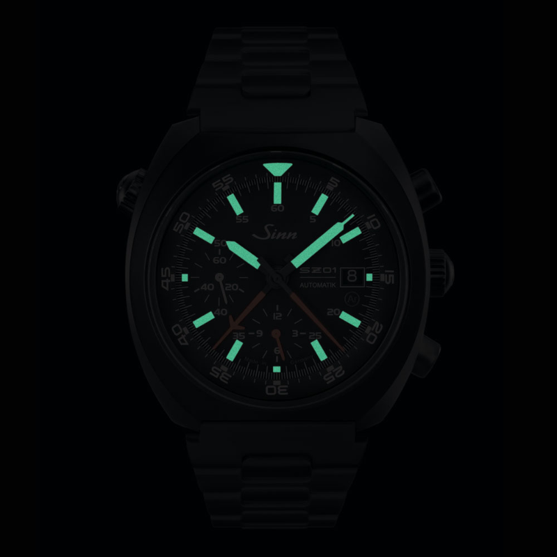 【Sinn】は特殊オイル66-228・Arドライテクノロジー・ハイドロシステム・マグネチックフィールドプロテクション・テギメント加工など、様々な技術を用い、視認性、機能性を最重要視したプロユースのドイツ製腕時計です。 1985年にドイツの物理学者兼宇宙飛行士のラインハルト・フラーが、スペースラブD1ミッションの際にオリジナルモデルを装着し、自動巻時計が無重力空間でも作動するということを立証した【スペース・クロノグラフ】のレギュラーモデル。 サンドマット仕上げのケースにブラックダイヤルを装備。新型キャリバー『SZ01』はクロノグラフを読み取りやすくするためにセンター配置の60分積算計が搭載されており、ミリタリーの名機『レマニア』を搭載したオリジナルと同様です。耐傷性の高いテギメント加工を施し、Arドライテクノロジーも搭載しています。 是非ご試着にご来店ください!