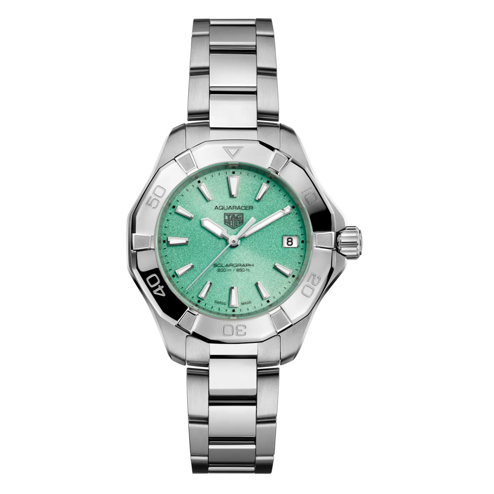 オーロラの永遠の美しさを感じさせる、ソーラーグラフ ムーブメントを搭載したポーラーブルーカラーの「タグ・ホイヤー アクアレーサー」。冒険を求める現代人のために作られた34mmのこのタイムピースは、大自然から都会のスタイルへ簡単に切り替えることのできる、汎用性に優れたツールです。