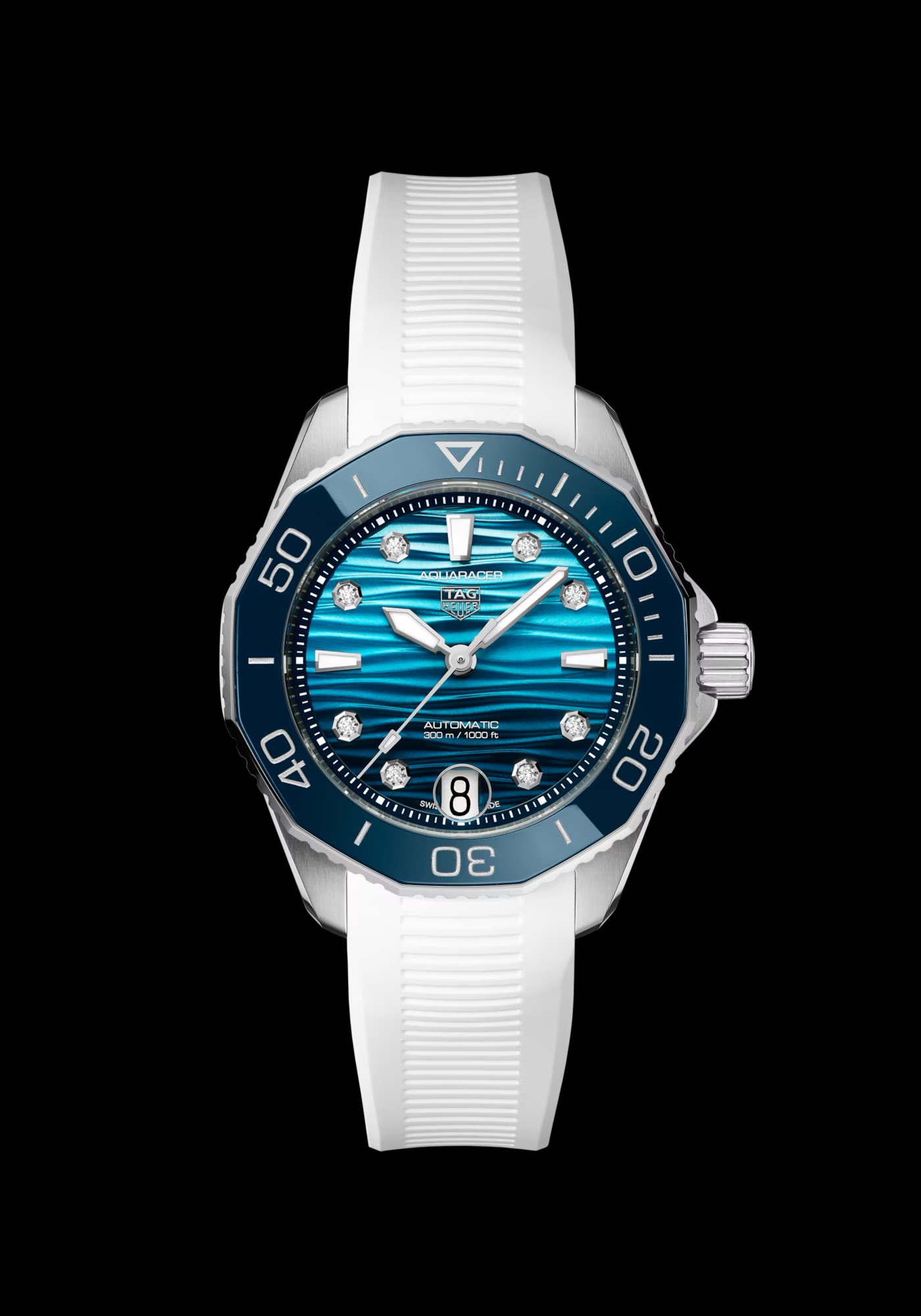 深い海の魅惑的な色彩を思わせる、グラデーションブルーのダイヤル。VS+ ダイヤモンドがセットされた8つのインデックスと、スーパールミノバ® が塗布されたロジウムプレートの針を備え、暗い中でも最適な視認性を約束します。