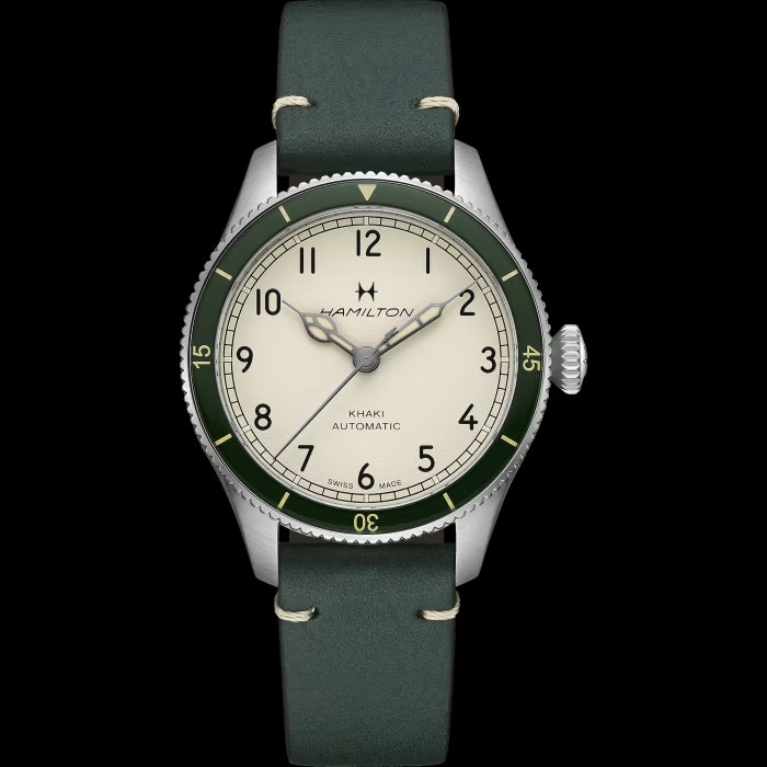 モスグリーンの輝きを放ち、カラー仕上げの回転ベゼルを備えたモデルは、H-10ムーブメントを搭載し、標準持続時間80時間を誇ります。