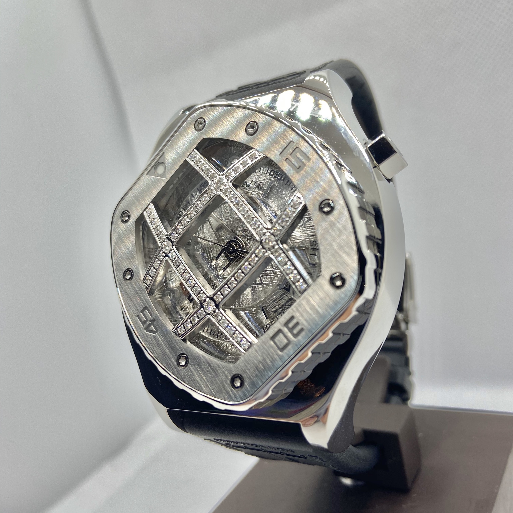 希少な隕石、メテオライトを使用した文字盤と、ケース全面を覆うコンベックスグリッドが特徴的なモデル。