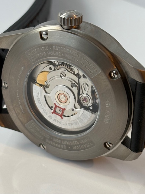仕様:パワーリザーブ約56時間、スケルトン、シースルーバック、フォールディングバックル、ジャンピングアワー、レトログラード、パワーリザーブインジゲーター、ねじ込み式リューズ