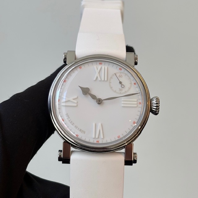 仕様:パワーリザーブ約52時間、28,800振動/時、スモールセコンド、ホワイトラッカーダイヤル、ホワイトマット&スーパールミノバインデックス、シースルーバック、ビックベン針