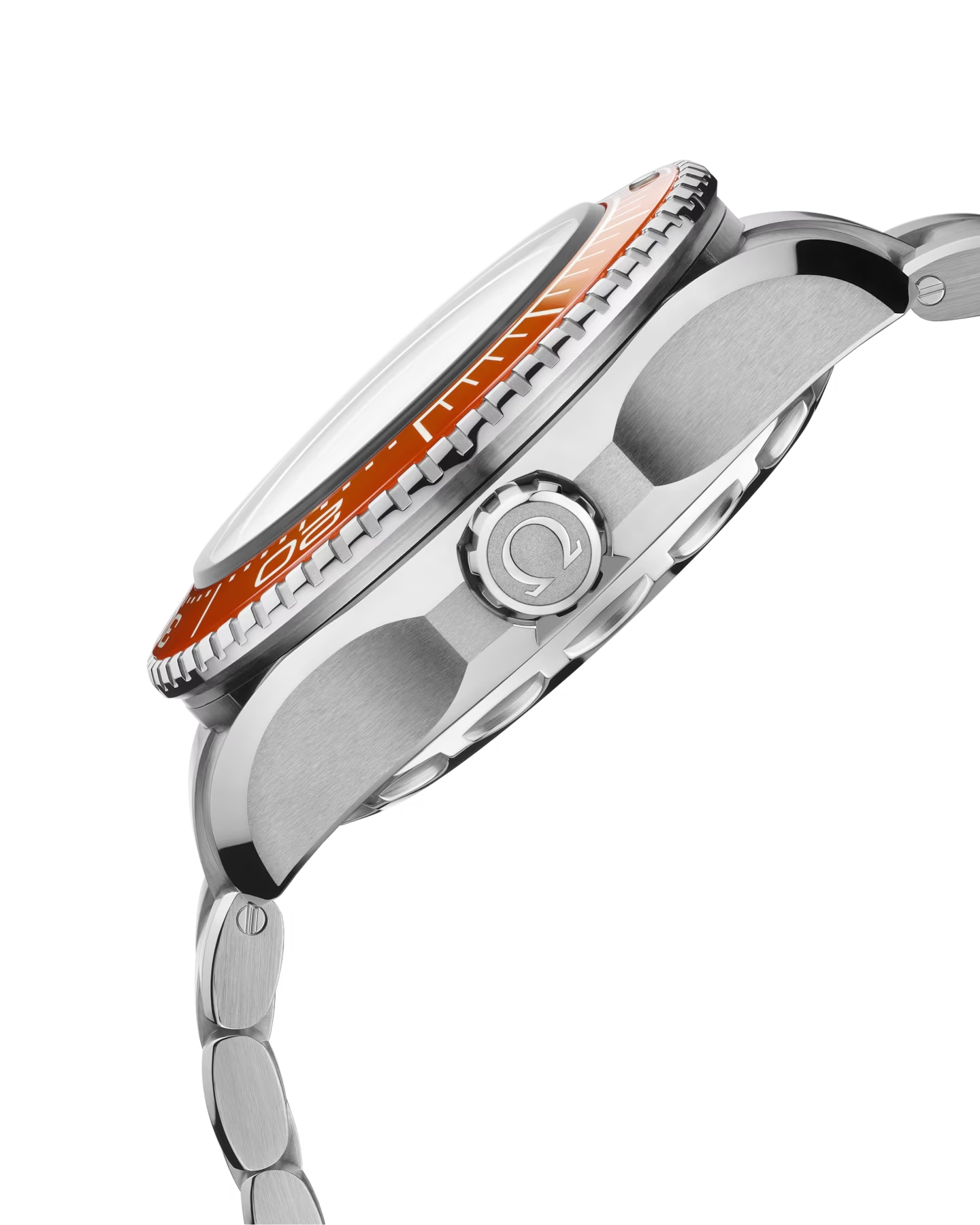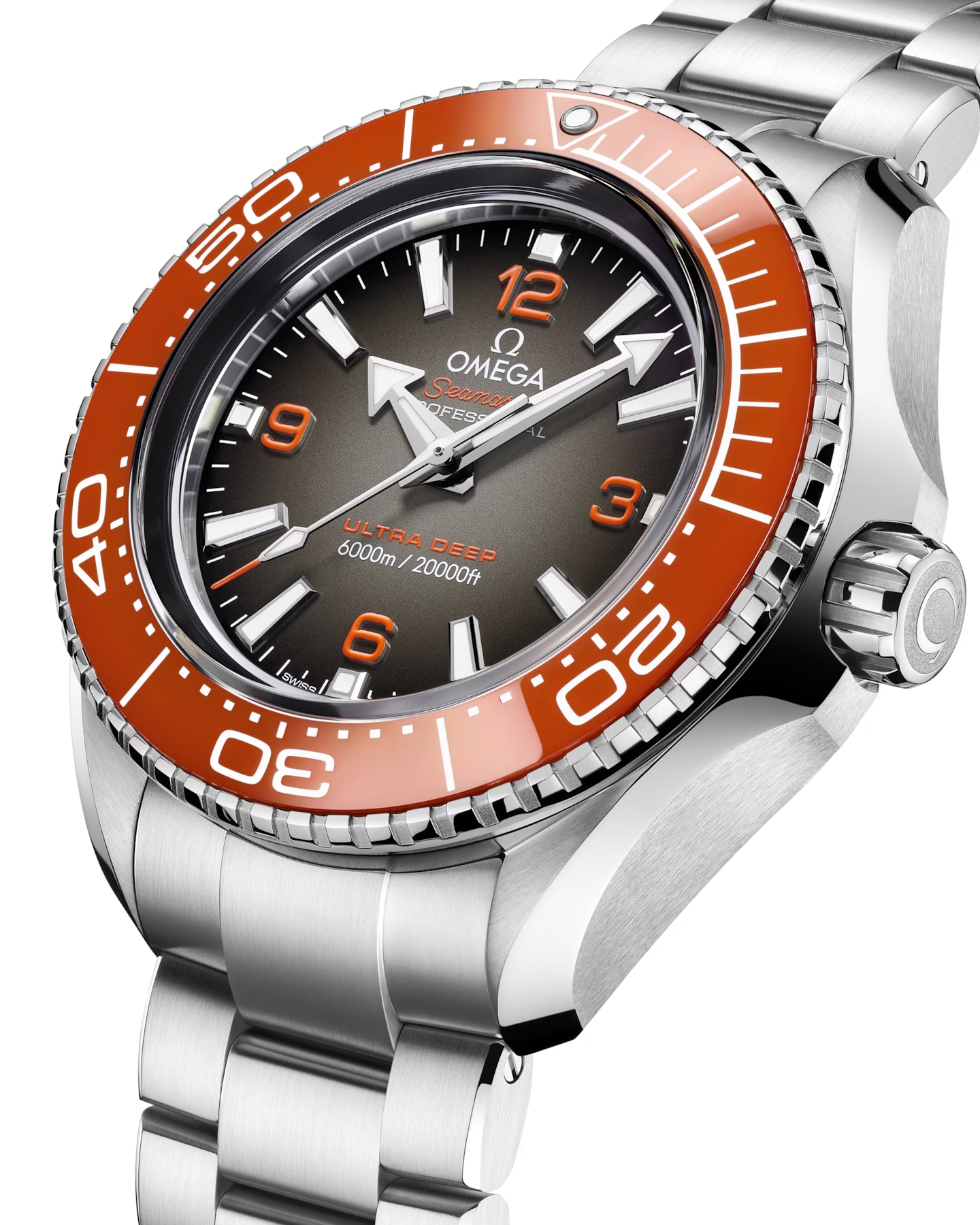 45.5 mmの堅牢なO-MEGASTEEL製モデルは、ポリッシュ仕上げのオレンジセラミック製ベゼルと、スーパールミノヴァを塗布したリキッドセラミック製ダイビングスケールを備えています。盛り上がったドーム型のサファイアクリスタルガラスを通して、グレーからブラックへと移り変わるラッカー仕上げのグラデーションダイヤルには、4つのオレンジのアラビア数字、18Kホワイトゴールド製の針、インデックスがあしらわれ、いずれにもホワイトのスーパールミノヴァが塗布されています。
