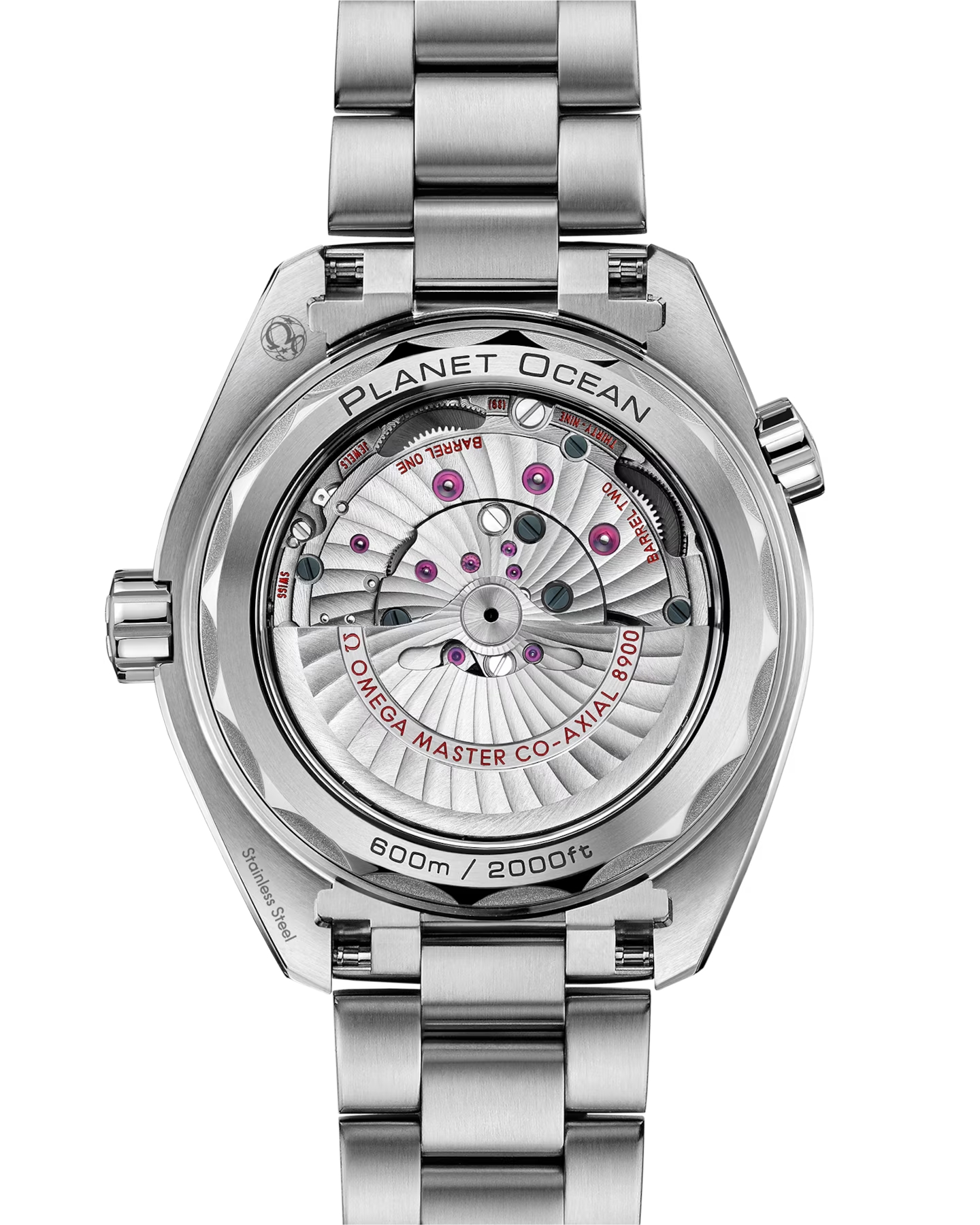 60気圧(600m/2000フィート)の防水性とヘリウム・エスケープバルブ付属。時計の心臓部にはオメガ マスター クロノメーター キャリバー8900が搭載されており、シースルーのケースバックから眺めることができます。この時計は、スイス連邦計量・認定局(Swiss Federal Institute of Metrology:METAS)が設定する8つの厳格な検査に合格し、マスター クロノメーターの認定を受けています。