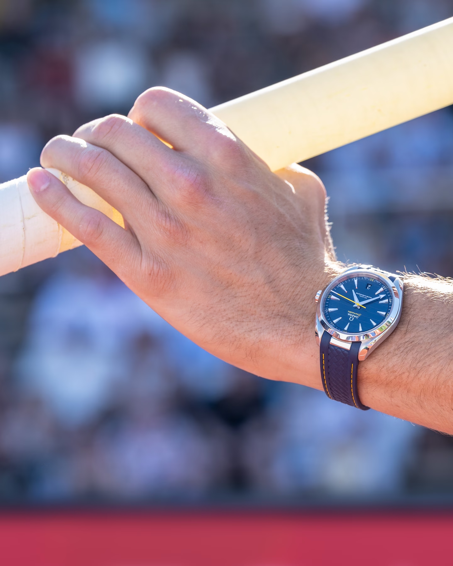 スウェーデンの棒高跳び選手、アルマンド “モンド” デュプランティス選手にインスピレーションを得た、他とは一線を画す「シーマスター アクアテラ」モデル。オリンピックでの金メダル、そして数々の驚異的な世界記録を誇る彼のスポーツにおける卓越性を、スタイリッシュに表現したデザインです。