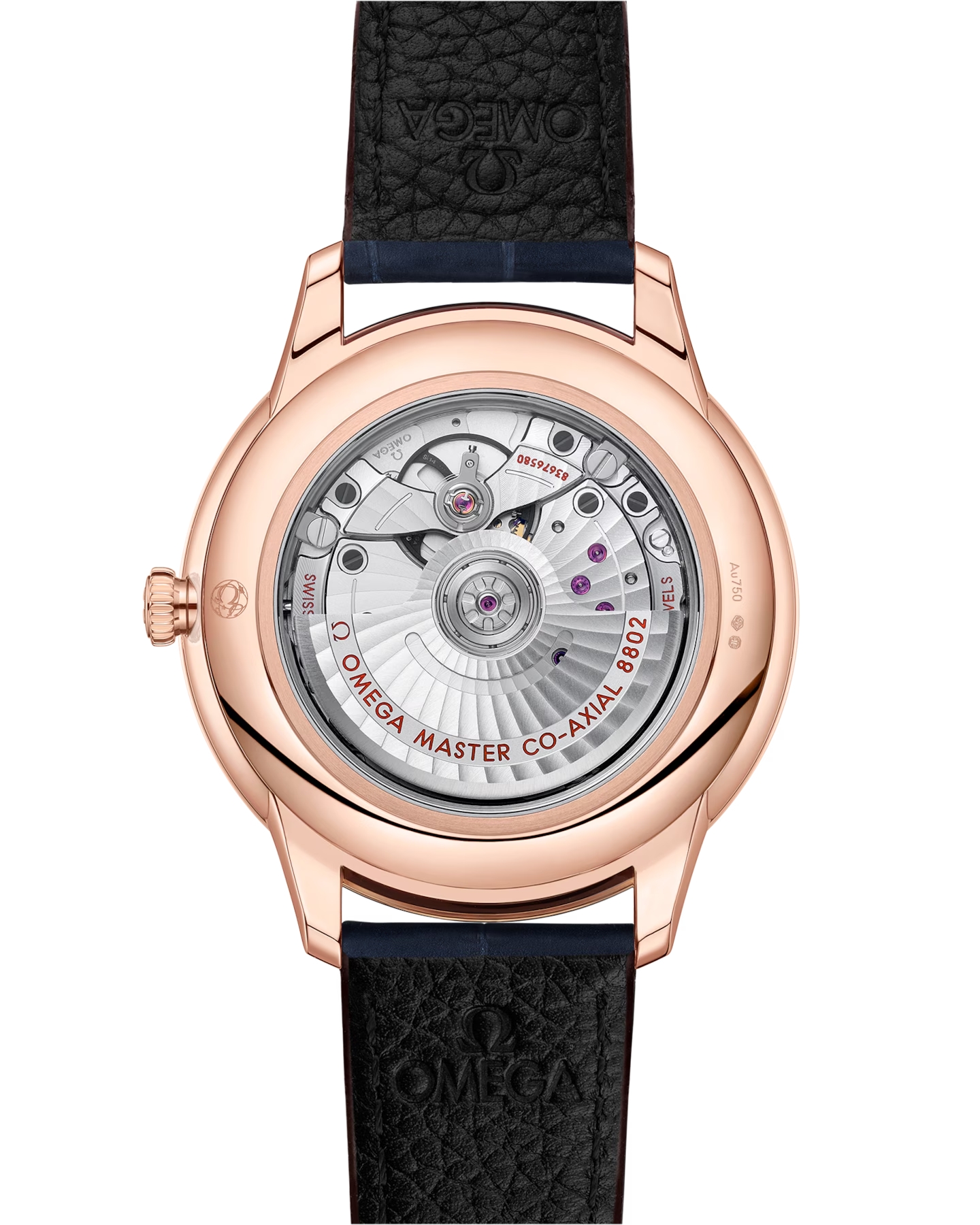 マスター クロノメーター認定を取得したこの時計は、ダークブルーのレザーストラップを備え、オメガ マスター コーアクシャル キャリバー 8802を傷の付きにくいサファイアクリスタル製ケースバックから眺めることができます。
