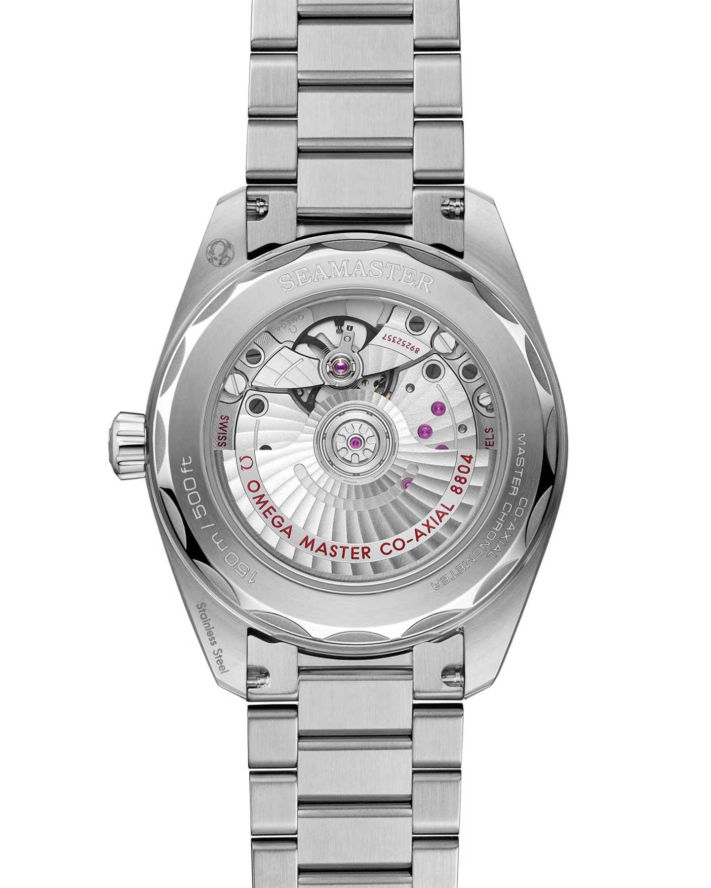 「レイルマスター」がもつ耐磁性のレガシーを継承する、コーアクシャル マスター クロノメーター キャリバー8804を搭載。15,000ガウスの耐磁性をもつこのムーブメントは、透明なサファイアクリスタルのケースバックから眺めることができます。