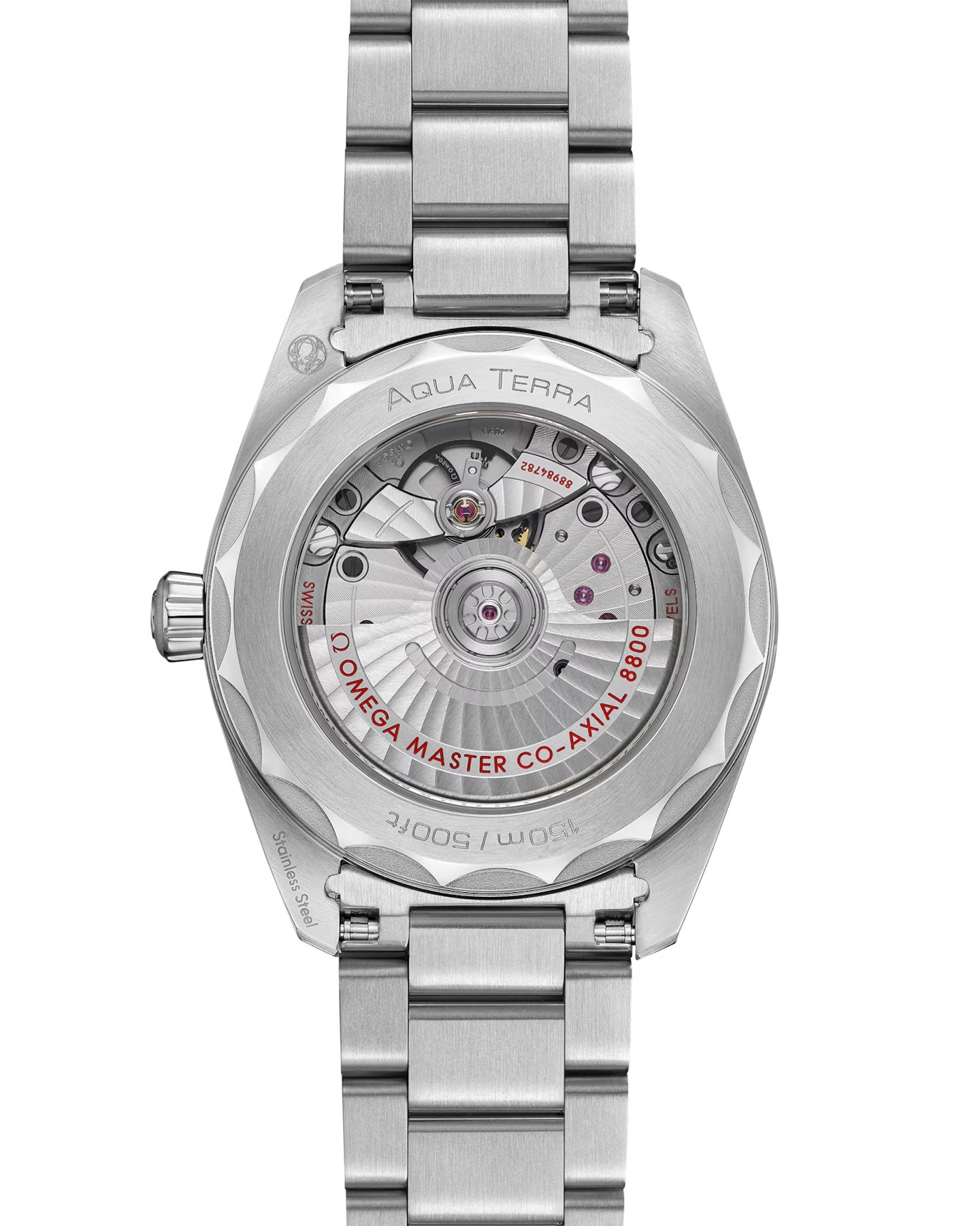 海に携わってきたオメガの長い歴史を代表する「シーマスター アクアテラ」 コレクション。シンメトリックな38mmのケースはステンレススティール製で、ケースバックにはウェーブ模様で縁取られたデザインが施されています。
