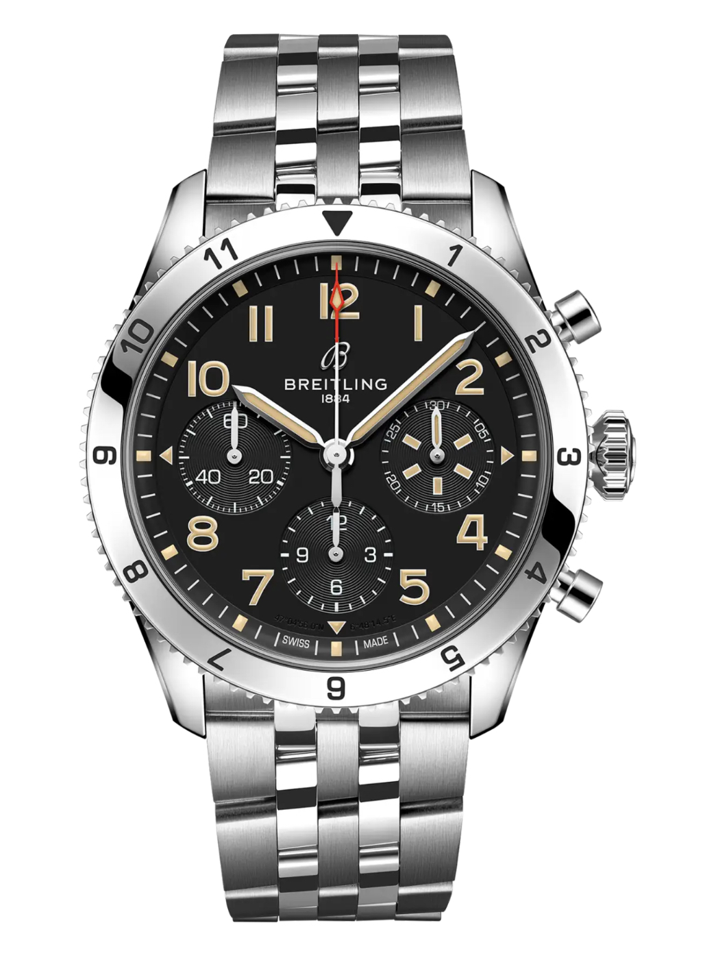 真のパイロットウォッチとして、当時のコックピットの過酷さに耐えられるようデザインされたクラシック アヴィ P-51 マスタングは、ダイヤルとベゼルに大きく読みやすいアラビア数字を採用。 42 mmのケースのベゼルには刻みが付いているので、パイロットが手袋をしたままであっても最適なグリップ感が得られます。ステッチを効かせたカーフスキンストラップはクラシックなフライトギアに施された縫い目に由来するデザイン。一方オプションのステンレス製ブレスレットではエレガントなスタイルを楽しめます。ウォッチの読みやすさと装着感、また控えめなスタイルは、パイロットや旅行者にとって魅力的なものでしょう。クラシック アヴィを駆動するのはCOSC認定のブライトリングキャリバー23ムーブメント。約48時間のパワーリザーブを誇ります。