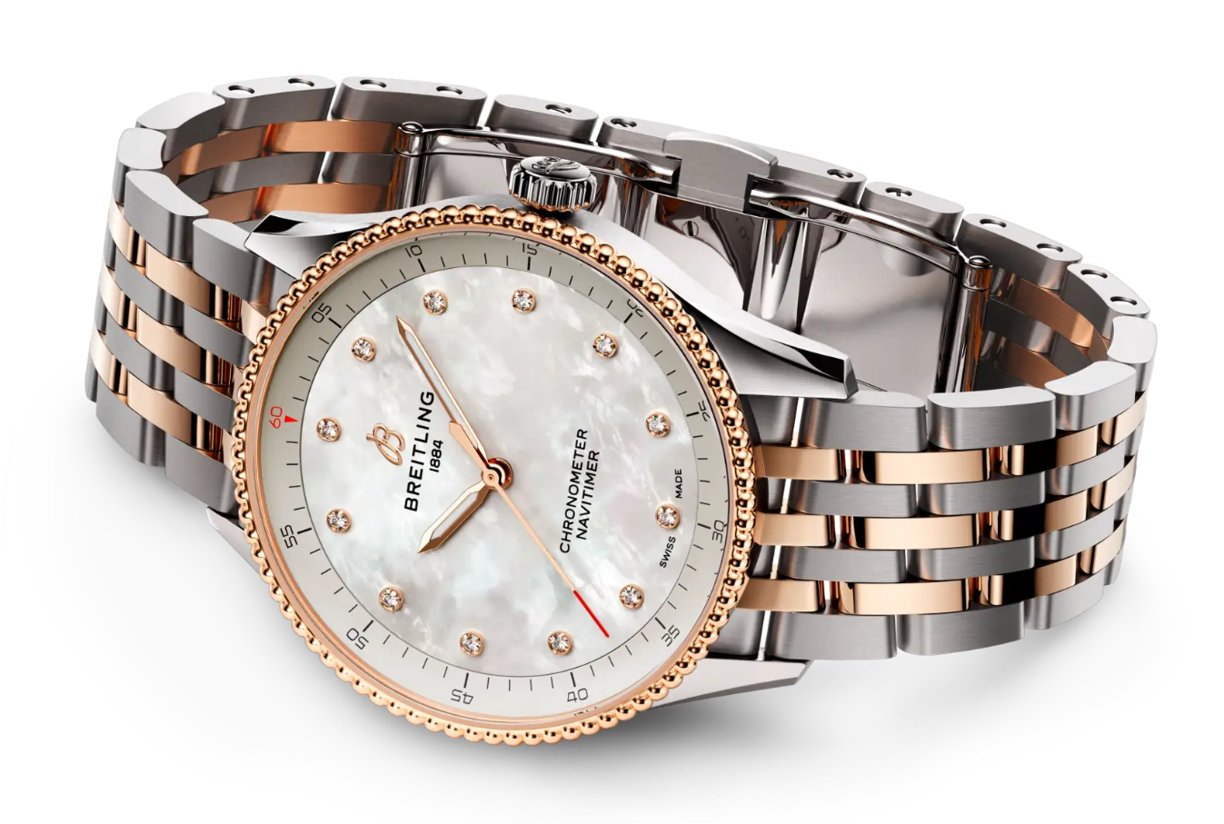 小さめの腕時計の外観と感覚を好む男女に向けて、36 mmと32 mmのサイズをご用意しました。36 mmモデルは、ビーズ装飾のベゼルとアイコニックな回転計算尺により一目でそれと分かるナビタイマーを、一方、32 mmモデルは、スリムな直径に適した計算尺のないシンプルなダイヤルデザインを採用しています。 しかし、このアイコンには、新しいサイズ以外にも見どころはたくさんあります。パステルカラー、マザーオブパール、トレーサブルな貴金属と洗練された上品さが相まって、ジュエリーのような魅力を放ちます。―この伝説的なナビゲーションウォッチに、どこへ向かう旅でもお供できるしなやかなエレガンスが加わりました。