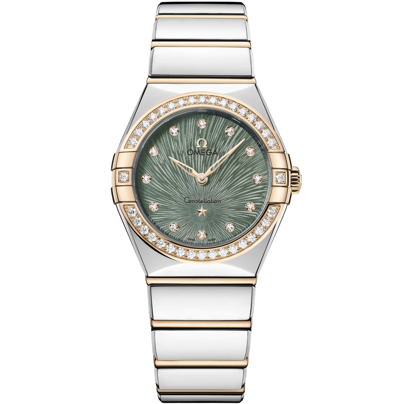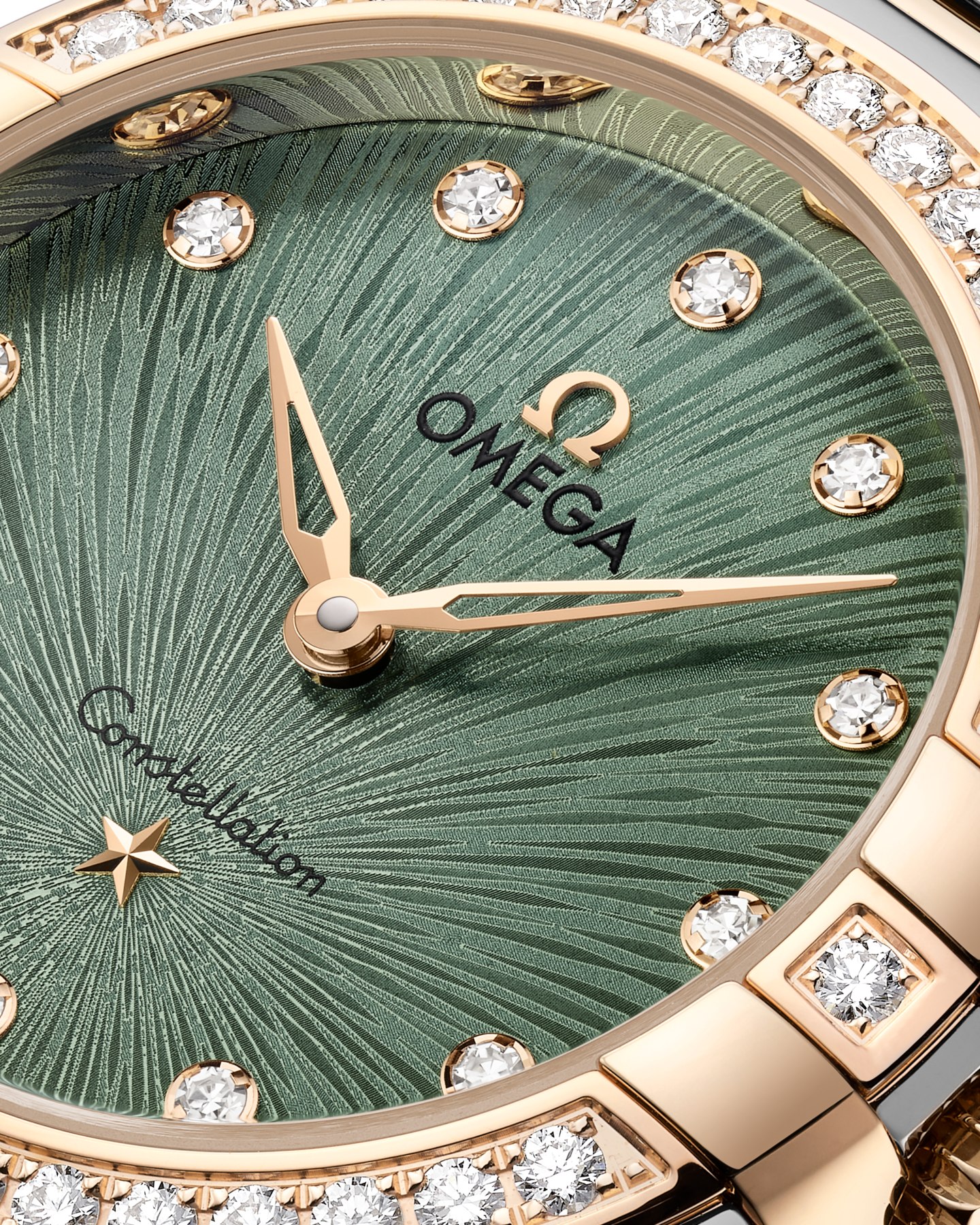 ケース径28mmのモデルはステンレススティール&18Kムーンシャイン™ ゴールド製で、ベゼルにはパヴェセッティングされたダイヤモンドが輝きます。PVDによるグリーンダイアルは、エレクトロケミカルエッチング技術を用いた特徴的なスーパーノヴァ模様が描かれているほか、18Kムーンシャイン™ ゴールド製の針と星、18Kムーンシャイン™ ゴールドのホルダーにセットされたダイヤモンドのインデックスを備えます。