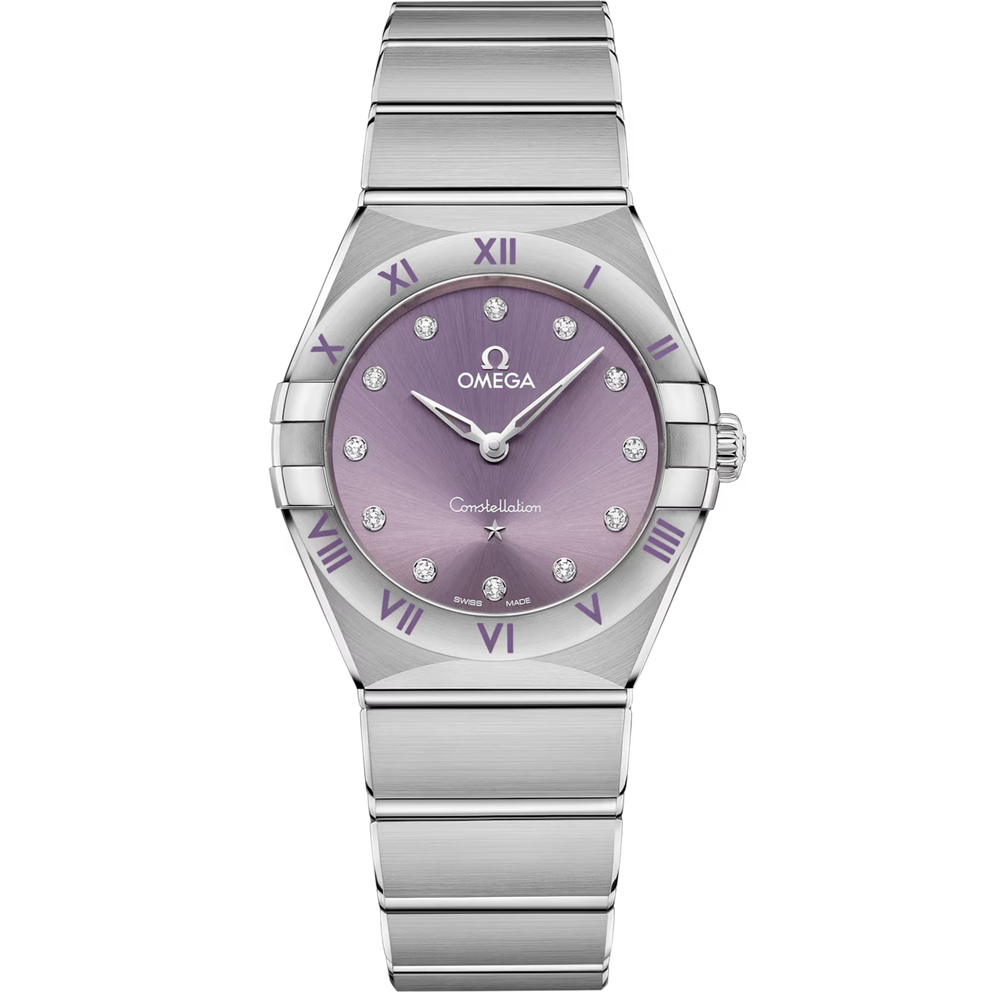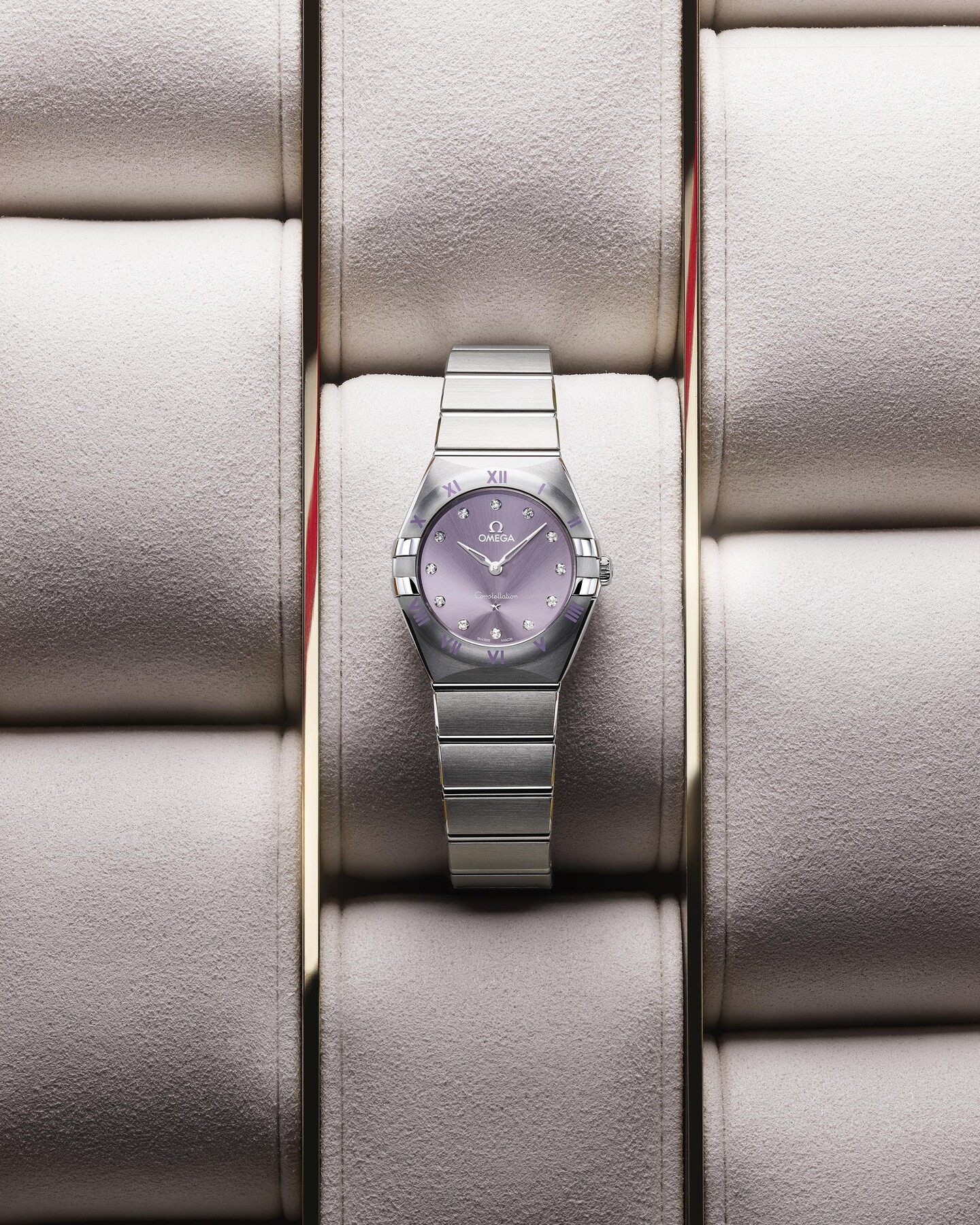 ステンレススティール製のケースとブレスレットを備える28mmサイズのモデルには、パチュリの花のような淡い紫の文字盤に、18Kホワイトゴールドのインデックスとエレメントが施されています。