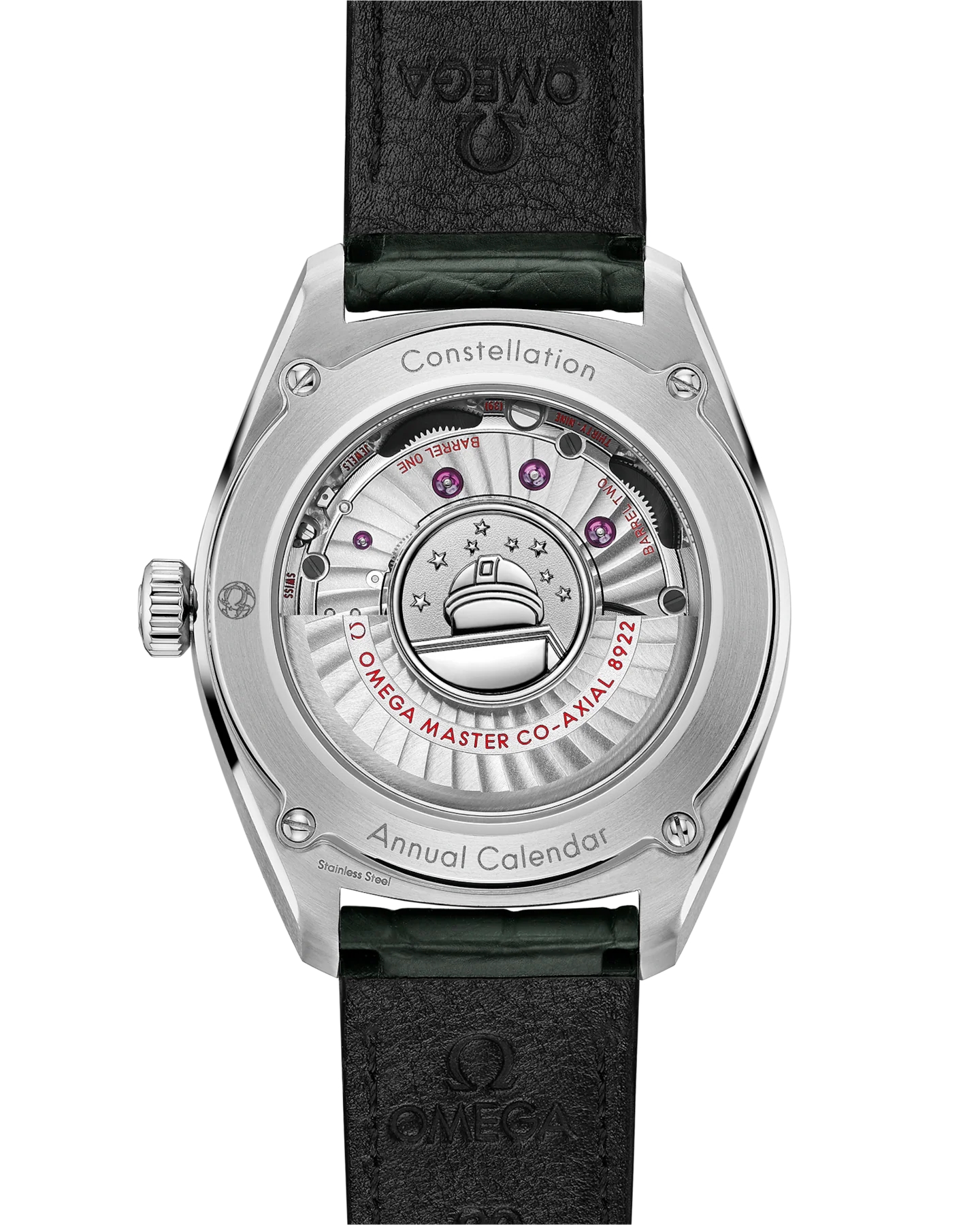 1952年の最初の「コンステレーション」モデルを彷彿とさせるサンブラッシュ仕上げのグリーンの“パイパン”ダイアル。淵を飾る12個の面には、アニュアルカレンダー機能を踏まえて各月が記されています。18Kホワイトゴールドの「コンステレーション」の星、オメガのロゴ、スーパールミノヴァが塗布された18Kホワイトゴールドのファセット加工の針とインデックスが備わっています。