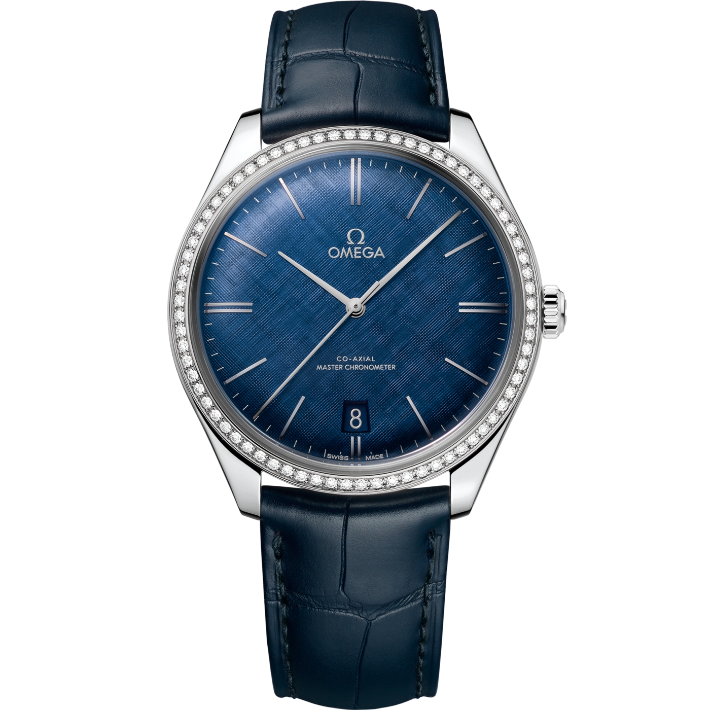 このモデルは40 mmのステンレススティール製ケースを採用し、ダイヤモンドをパヴェセッティングしたベゼルを備えます。ブルーレザーストラップが付属。ドーム型のオパリンシルバーのダイアルには、6時位置の日付表示や、18Kホワイトゴールドの針とインデックスが配されています。