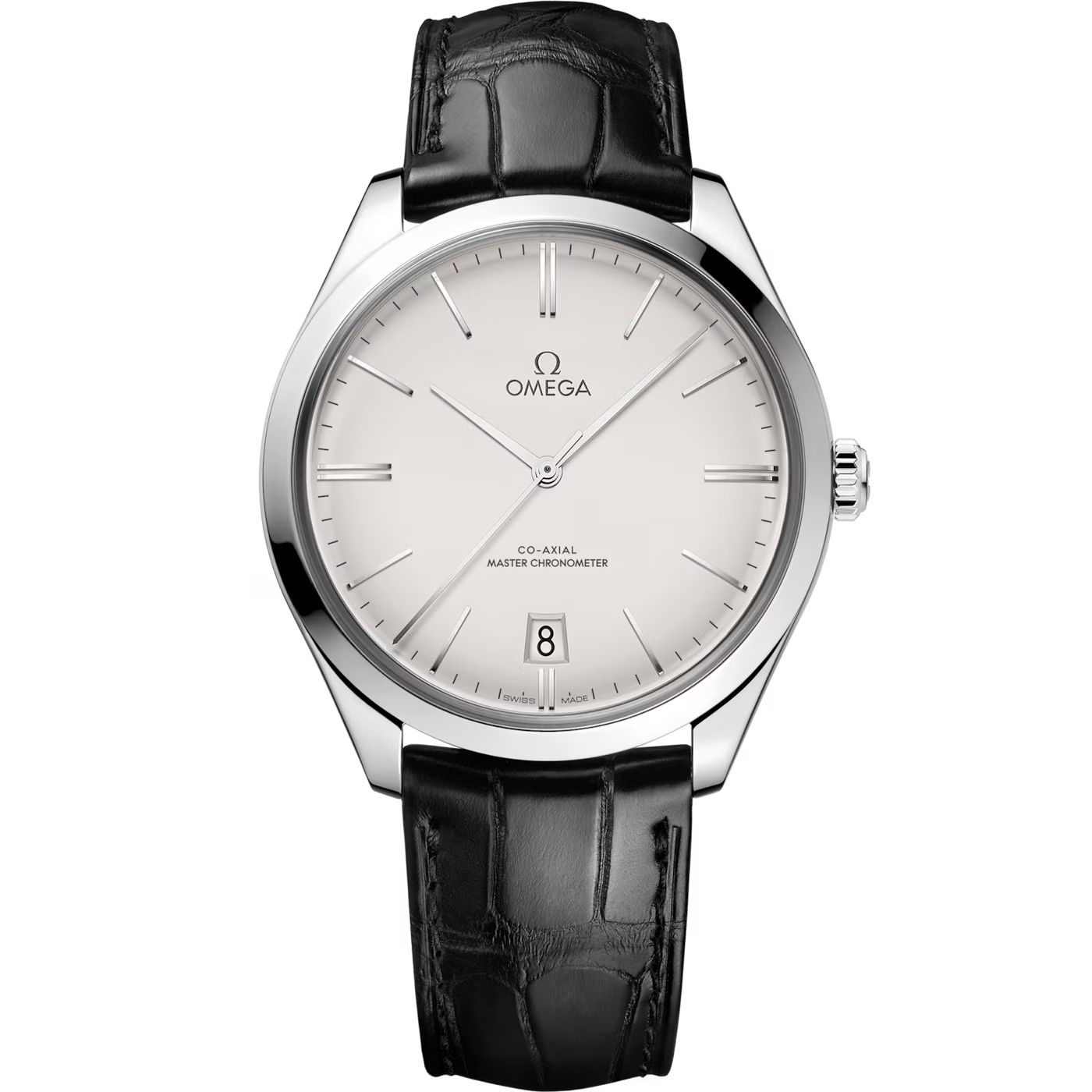 この40 mmのステンレススティール製ケースには、ブラックレザーストラップが付属。ドーム型のオパリンシルバーのダイアルには、6時位置の日付表示や、18Kホワイトゴールドの針とインデックスが配されています。