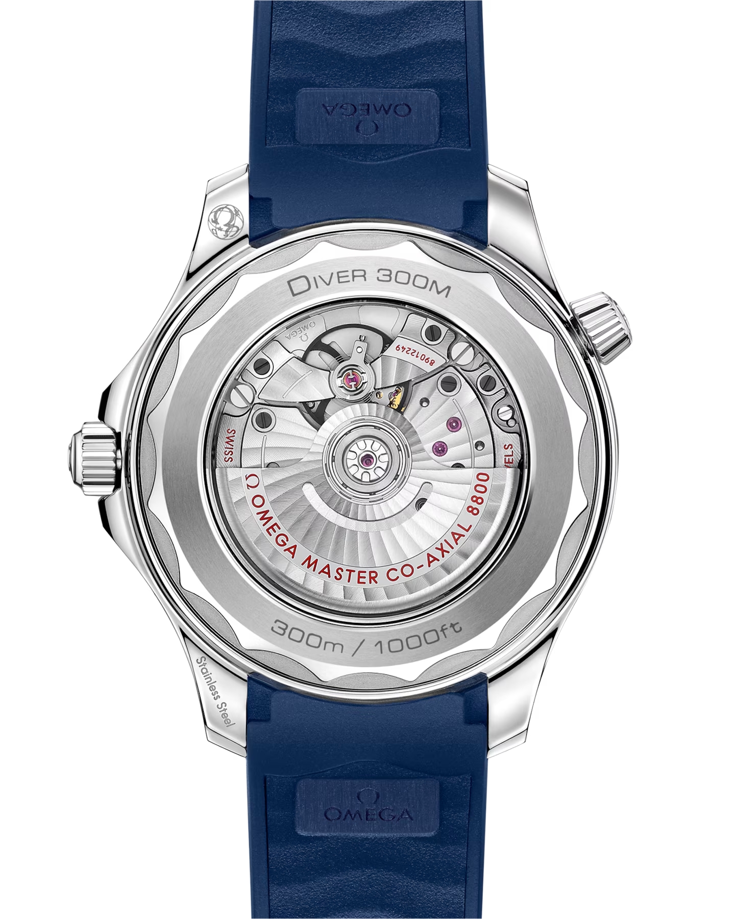 ブルーラバー製のストラップが付属。オメガ マスター クロノメーター キャリバー 8800が搭載され、波模様で縁取られたサファイア・クリスタルのケースバックから眺めることができます。