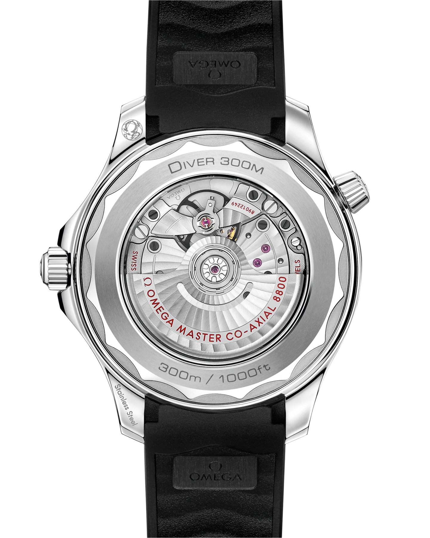 ブラックラバー製のストラップが付属。オメガ マスター クロノメーター キャリバー 8800が搭載され、波模様で縁取られたサファイア・クリスタルのケースバックから眺めることができます。
