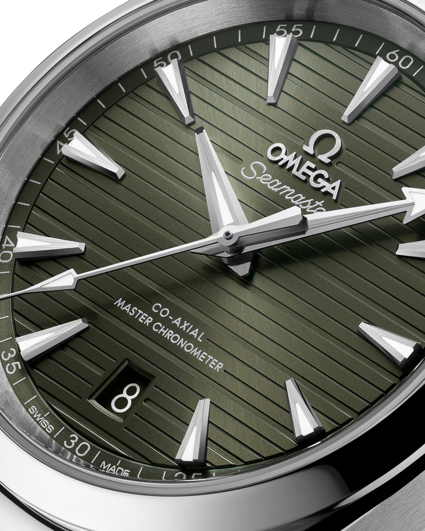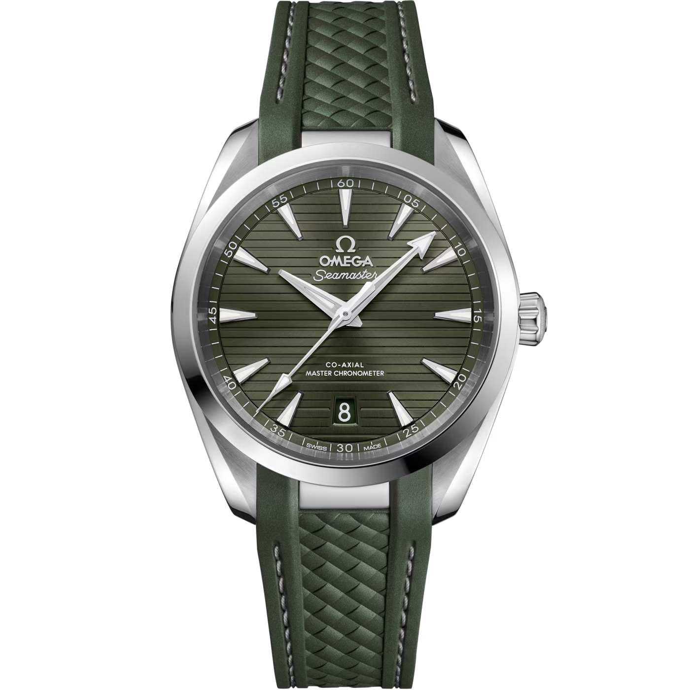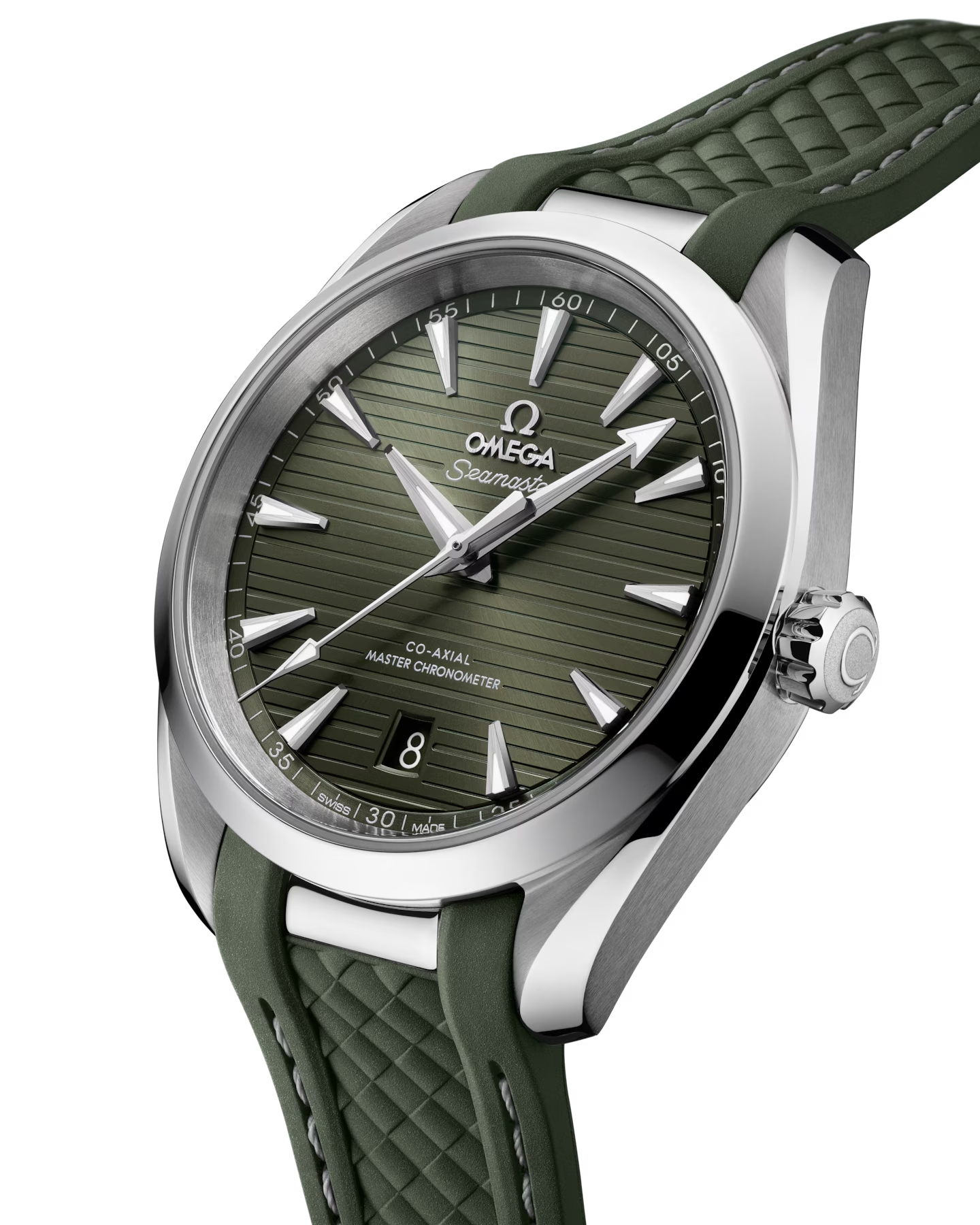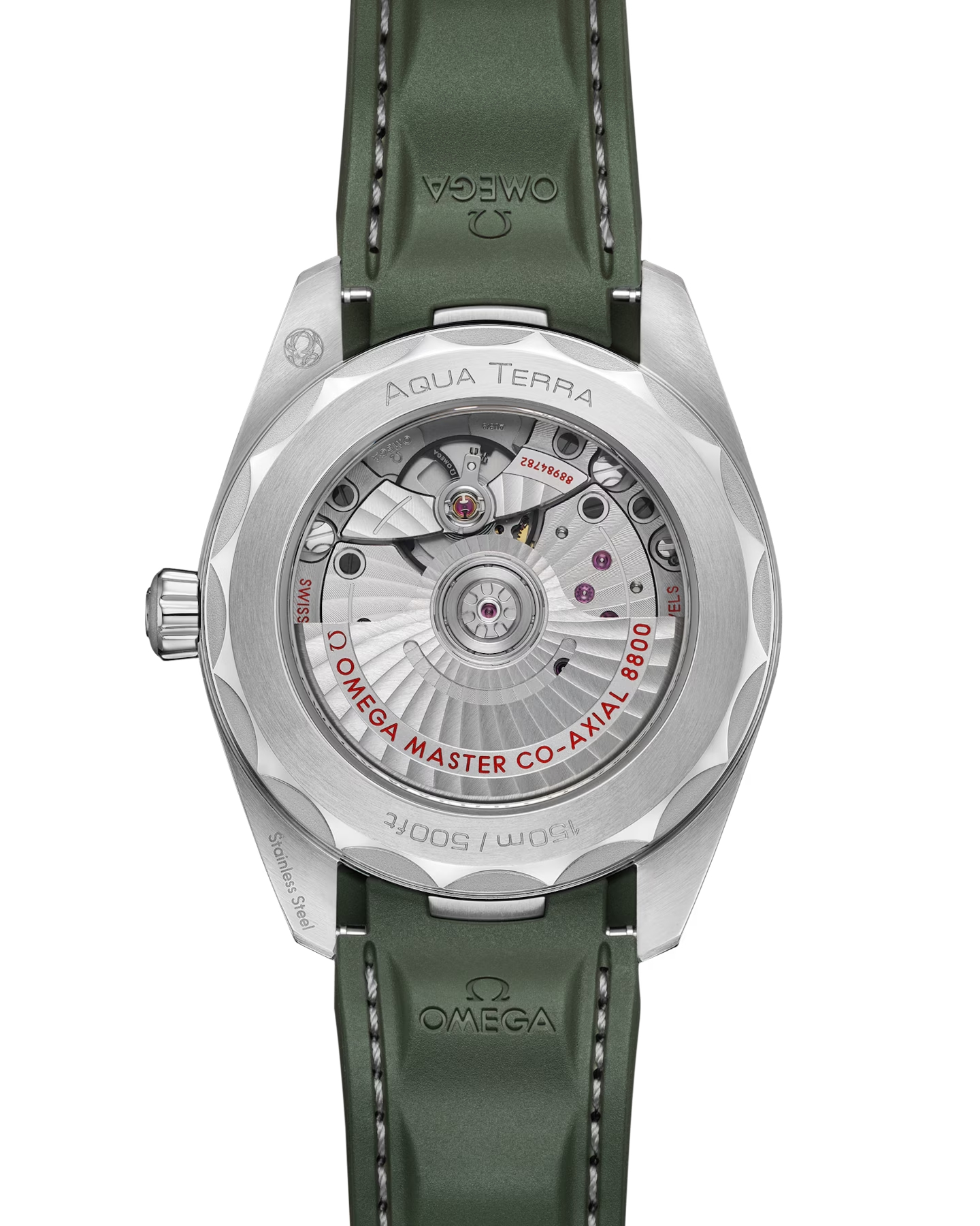 一体型構造のストラップは、グレーのステッチを施したグリーンラバー製。ポリッシュ&サテン仕上げのフォールディングクラスプが付いています。スイス連邦計量・認定局(METAS)が認めた最高水準を誇るオメガ マスター クロノメーター キャリバー8800搭載。