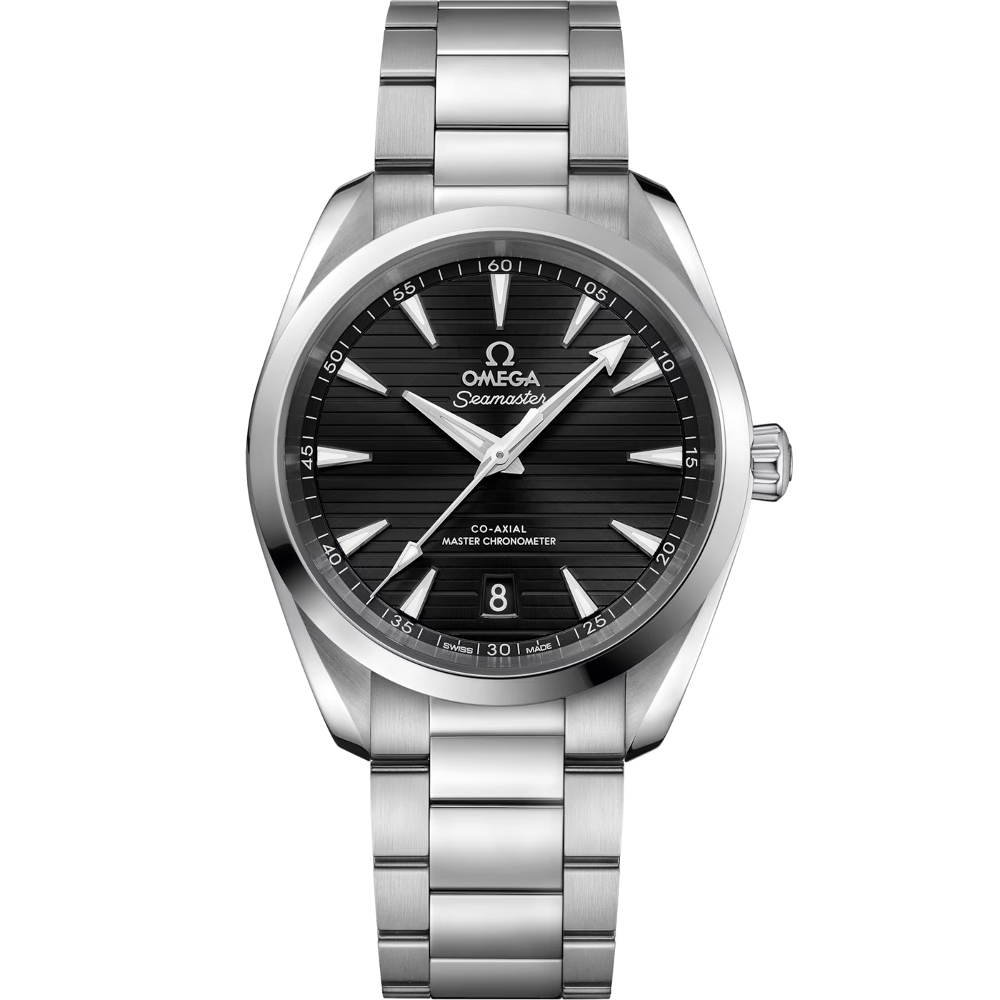 海に携わってきたオメガの長い歴史を代表する「シーマスター アクアテラ」 コレクション。シンメトリックな38mmのケースはステンレススティール製で、ケースバックにはウェーブ模様で縁取られたデザインが施されています。