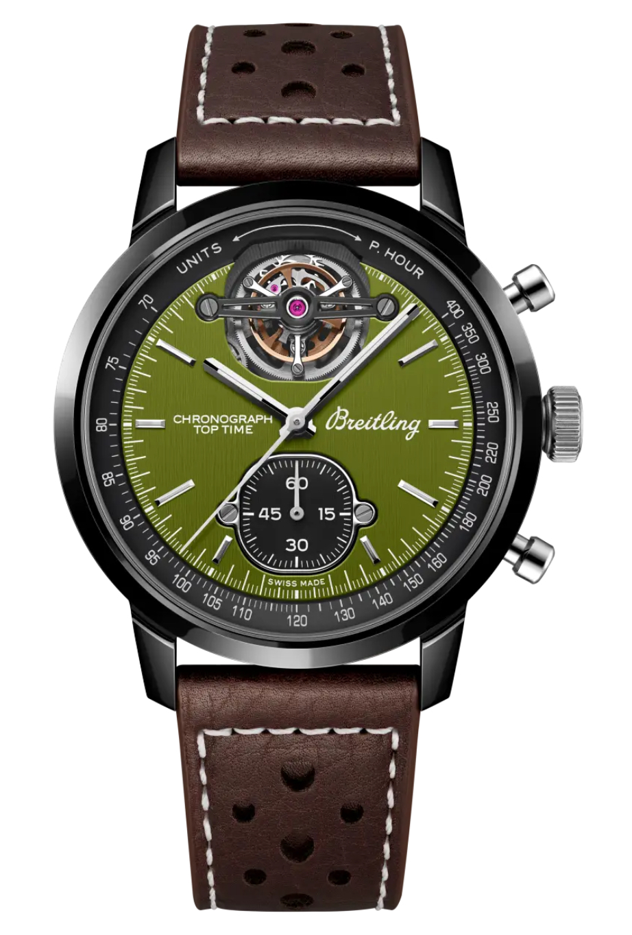ブライトリング創業140周年を迎えた2024年、かつてない日本限定モデルの最高峰として生まれたのが、トップタイム B21 クロノグラフ トゥールビヨン 42 ジャパン リミテッド。従来にはない落ち着いたトーンのグリーンは、自由を謳歌する60年代―70年代の名車達から着想を得たもの。ボンネットから覗くエンジンさながらに、12時位置に鎮座するトゥールビヨンが無類の存在感を放ちます。外周に「ONE OF 10」の刻印を施したケースバックはサファイアクリスタル製。ヴィンテージカーのステアリングを思わせるデザインのローター越しに、トゥールビヨンとクロノグラフという珍しい組み合わせを実現したキャリバーB21の動きを楽しんでいただくことができます。ブラックセラミックケースにチタンを細部に使用し、一見すると重厚な雰囲気。しかし腕にすると一転してその軽快な着け心地に驚いていただけることでしょう。傷に強く、防水性能は100m。まさに、ドライブにも気軽に連れ出せるコンプリケーション・クロノグラフ。わずか10本のみが国内で販売となる未来のコレクション・ピースです。
