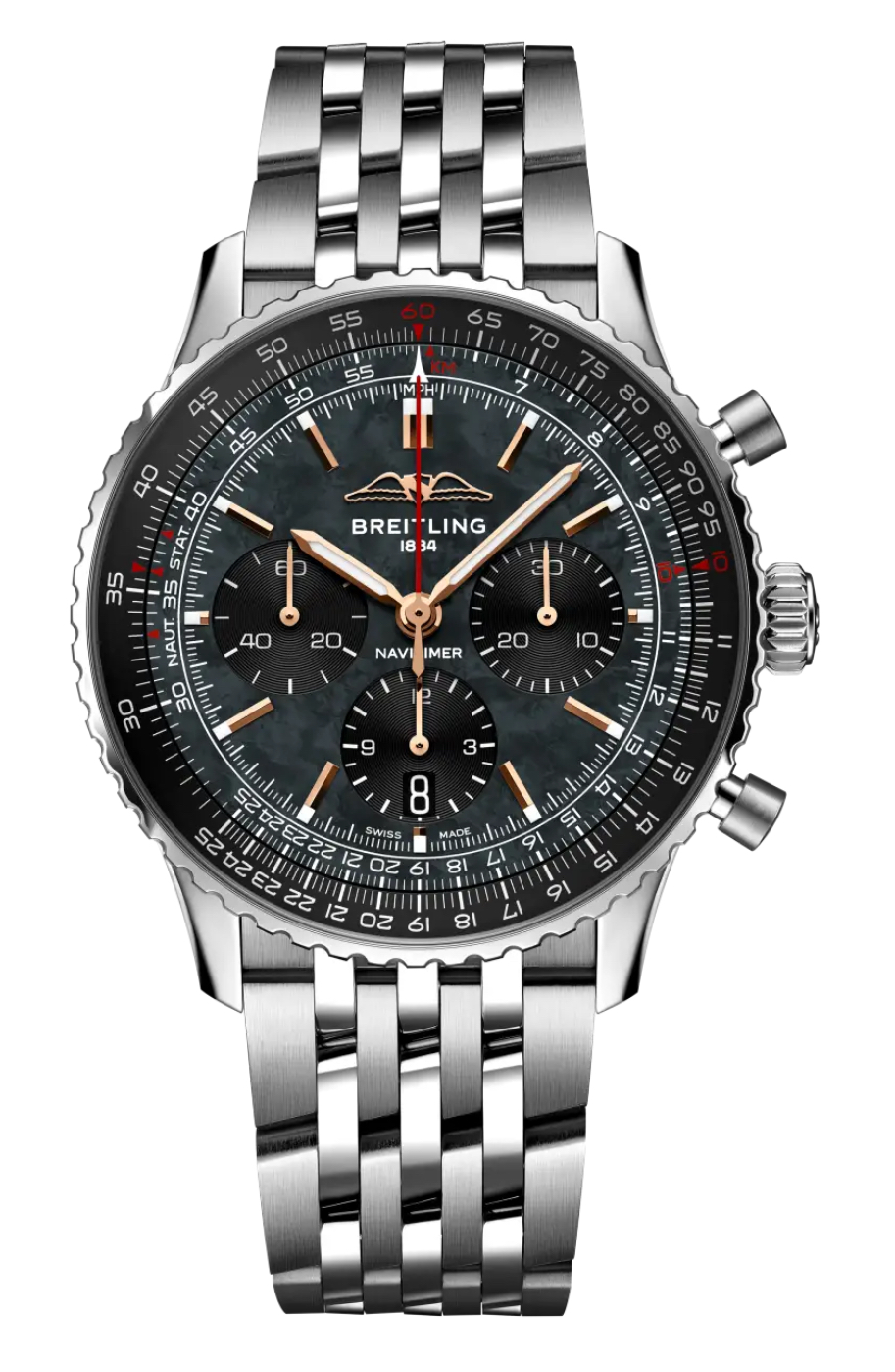2025年に登場したこの日本限定モデルは、人気のブラック・マザーオブパールを採用。月光を受けてほのかに浮かび上がる夜空の雲のような、神秘的で深みのある煌めきはこの素材でしか出せない特徴。搭載されるのはもちろんマニュファクチュール・クロノグラフ、ブライトリング キャリバー 01。サファイアクリスタル・ケースバック越しに、その精緻な動きを眺めていただくことが可能です。