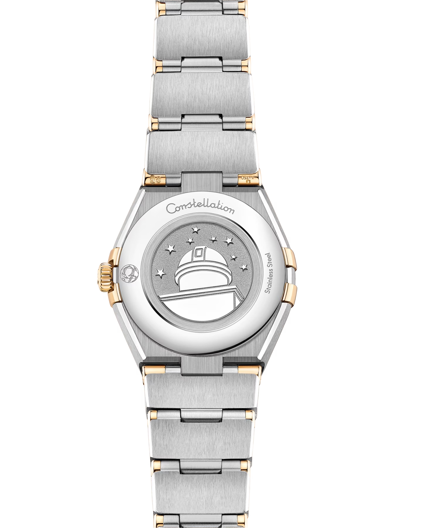 この25mmの18Kイエローゴールドとステンレススティール製のモデルは、ローマ数字が刻印されたベゼルが印象的で、ホワイトマザーオブパールのダイアルには、ダイヤモンドのインデックスが配され、傷の付きにくいサファイアクリスタルガラスが採用されています。針、オメガロゴ、コンステレーションの「星」、ダイヤモンドインデックスのベゼルにも18Kイエローゴールドが使用されています。