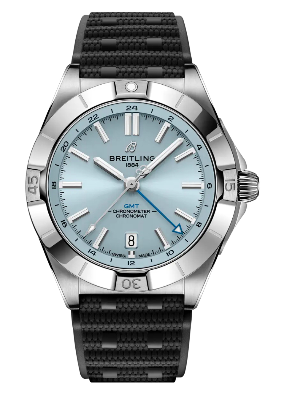 クロノマット オートマティック GMT 40は、デュアル タイムゾーン表示やさりげない美しさから、ブライトリングの旅行者へのオマージュが感じられるモデルです。繊細なダイヤルカラーは、プラチナとステンレススチール製ケースとブラックラバーベルトの組み合わせで、どんなファッションにもマッチします。同時に、同系色で統一された24時間目盛りをGMTの青い針がうまく引き立たせています。 GMTの複雑機構を駆動するのはブライトリング キャリバー 32。その24時間目盛りにより、第2タイムゾーンを追跡し、それが昼か夜かを一目で分かります。また、「オニオン型」リューズ(溝付きドーム形状にちなんだクラシックなクロノマット機能)により、簡単に調整できます。GMT 40はブライトリングの空、陸、海という世界観を超えた多目的スポーツウォッチであり、 200mという驚異的な防水性を備えています GMT 40の実用的なサイズと控えめなスタイルにより、「どんな状況にも応えるウォッチ」というクロノマットのミッションは、これまで以上に真実味を帯びています。スポーツジムでの使用に耐えうる堅牢性と、正装にも合うエレガンスを兼備しています。時計を旅行に持っていくなら、これです。