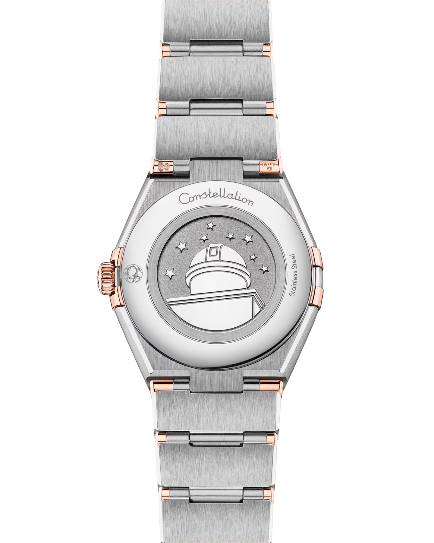 この28mmの18Kセドナ™ ゴールドとステンレススティール製のモデルは、ローマ数字が刻印されたベゼルが印象的で、ホワイトマザーオブパールのダイアルには、ダイヤモンドのインデックスが配され、傷の付きにくいサファイアクリスタルガラスが採用されています。針、オメガロゴ、コンステレーションの「星」、ダイヤモンドインデックスのベゼルにも18Kセドナ™ ゴールドが使用されています。