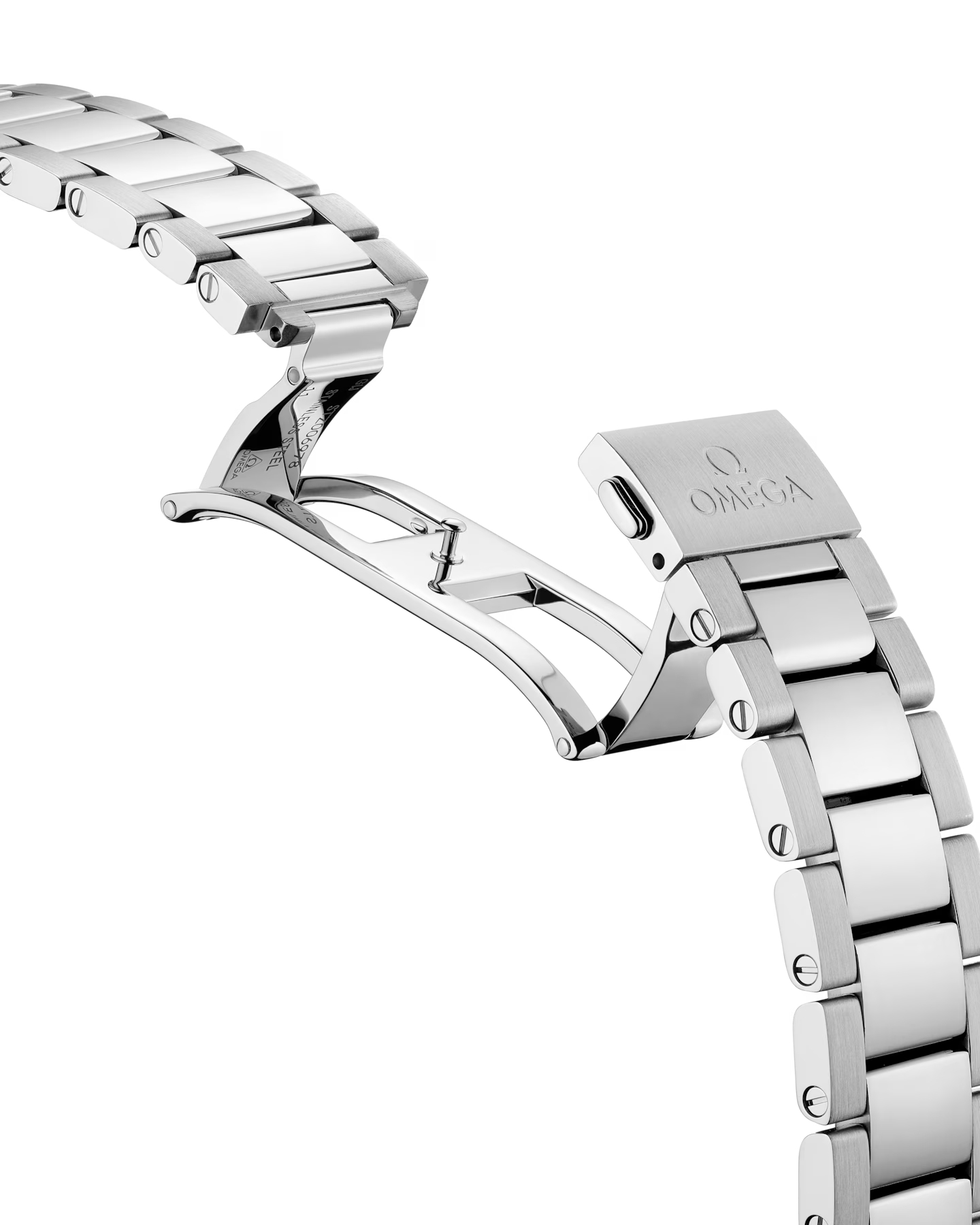 ブレスレットは、ポリッシュおよびサテン仕上げで、「スイス連邦計量・認定局(METAS)認定の最高水準を誇るオメガ コーアクシャル マスター クロノメーター キャリバー8800搭載。