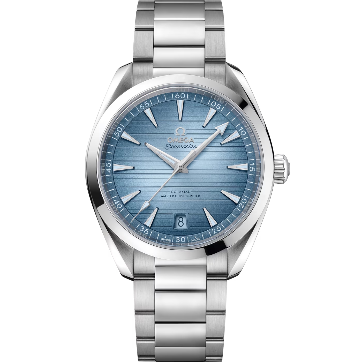 ポリッシュ&ブラッシュ仕上げを施したシメントリーなステンレススティール製ケースに収められた、41mmの「アクアテラ」。スティール製のブレスレットが合わせられています。