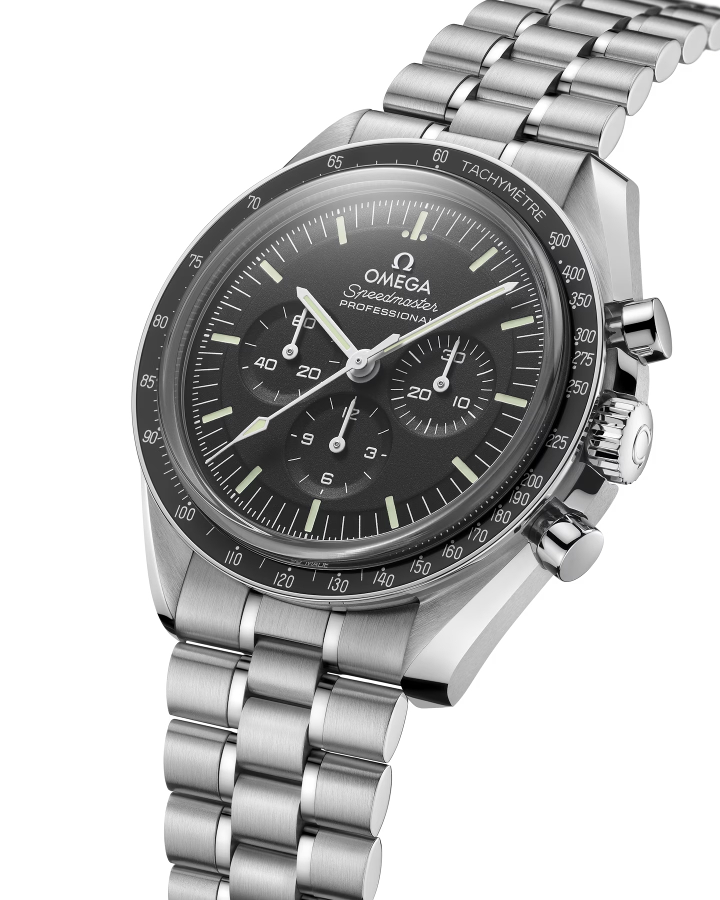 ポリッシュ仕上げとブラッシュ仕上げのアーチ型リンク5つで一列を構成するブレスレットが付属する、この42 mmのステンレススティール製ムーンウォッチは、フロントとケースバックにサファイアクリスタルガラスが採用されています。月面で着用された第4世代のスピードマスターのデザインからインスピレーションを得たこのモデルも、非対称ケース、オメガのアプライドロゴ付きの段差を設けたブラックダイアル、陽極酸化処理を施したアルミニウム製ベゼルリングに配された有名な「ドットオーバー90」(90の数字の上にドット)を採用しています。
