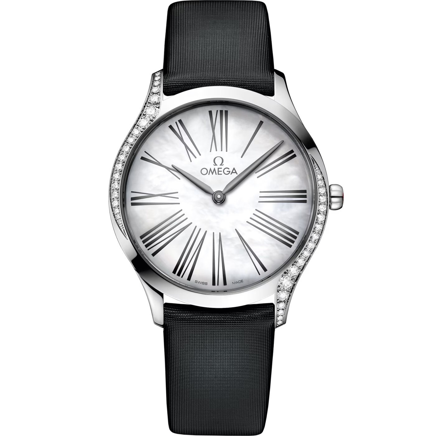 36㎜のスリムなケースはステンレススティール製で、両サイドを曲線に沿ってダイヤモンドが飾ります。リュウズはレッドのハイセラムでポリッシュ仕上げが施されており、ダイヤモンド1個がセットされています。マザーオブパールのダイアルには、転写されたユニークなローマ数字とエレガントなブラックの針が配されています。