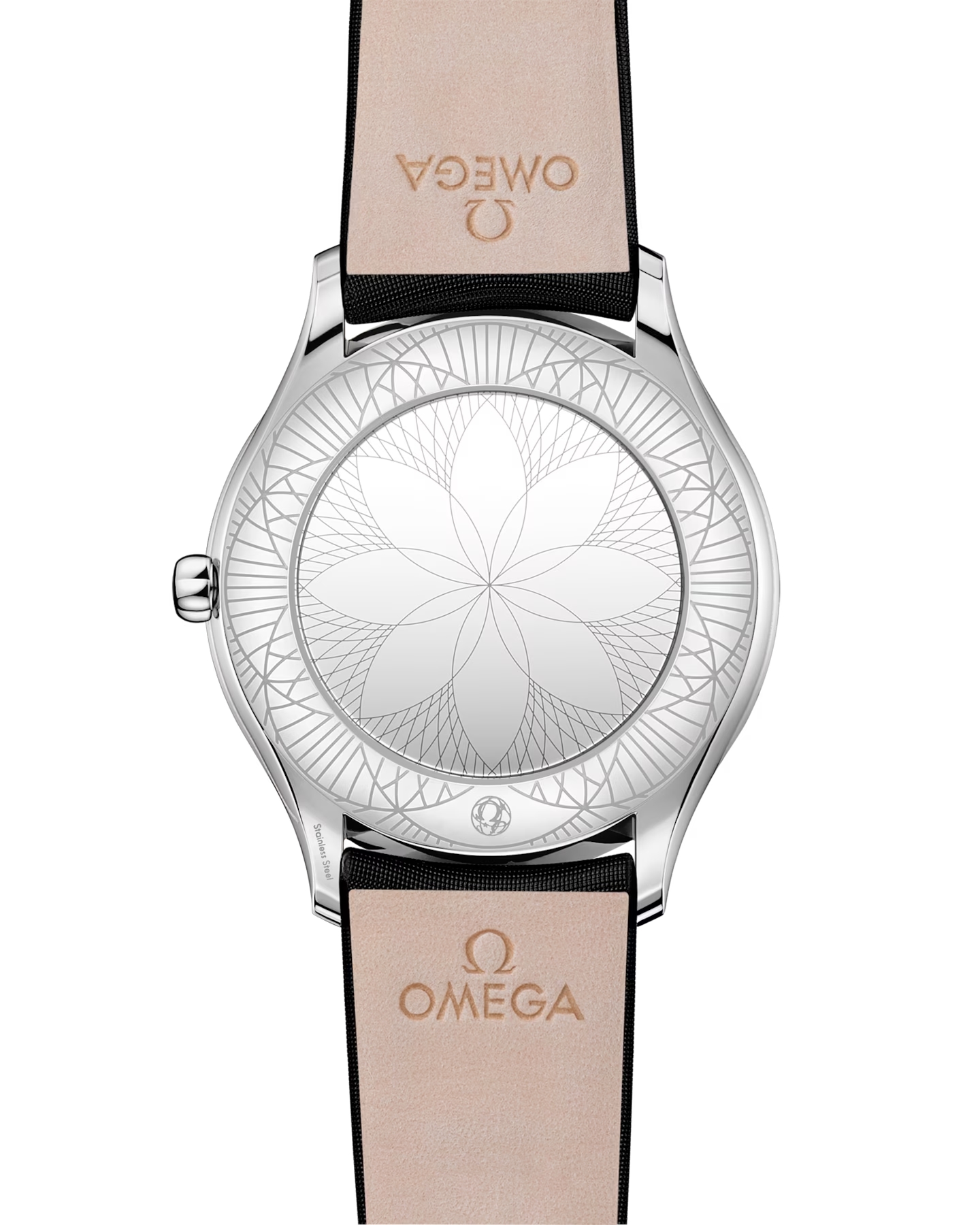 オメガ キャリバー 4061搭載。特殊な鏡面仕上げのケースバックには「Her Time」のパターンがあしらわれています。ブラックのファブリックストラップが付属。