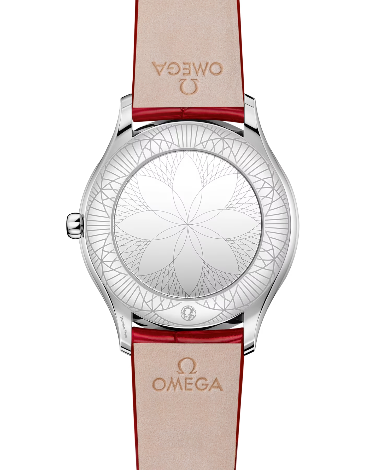 このモデルのケースはスリムな36 mmのステンレススティール製で、両サイドをエレガントな曲線に沿って38個のフルカットダイヤモンドが飾ります。ラッカー仕上げのレッドのダイアルには、転写されたローマ数字が配されています。リュウズには、5つのオメガロゴを組み合わせたセラミック製の赤いフラワーモチーフがあしらわれ、一粒のダイヤモンドがセットされています。
