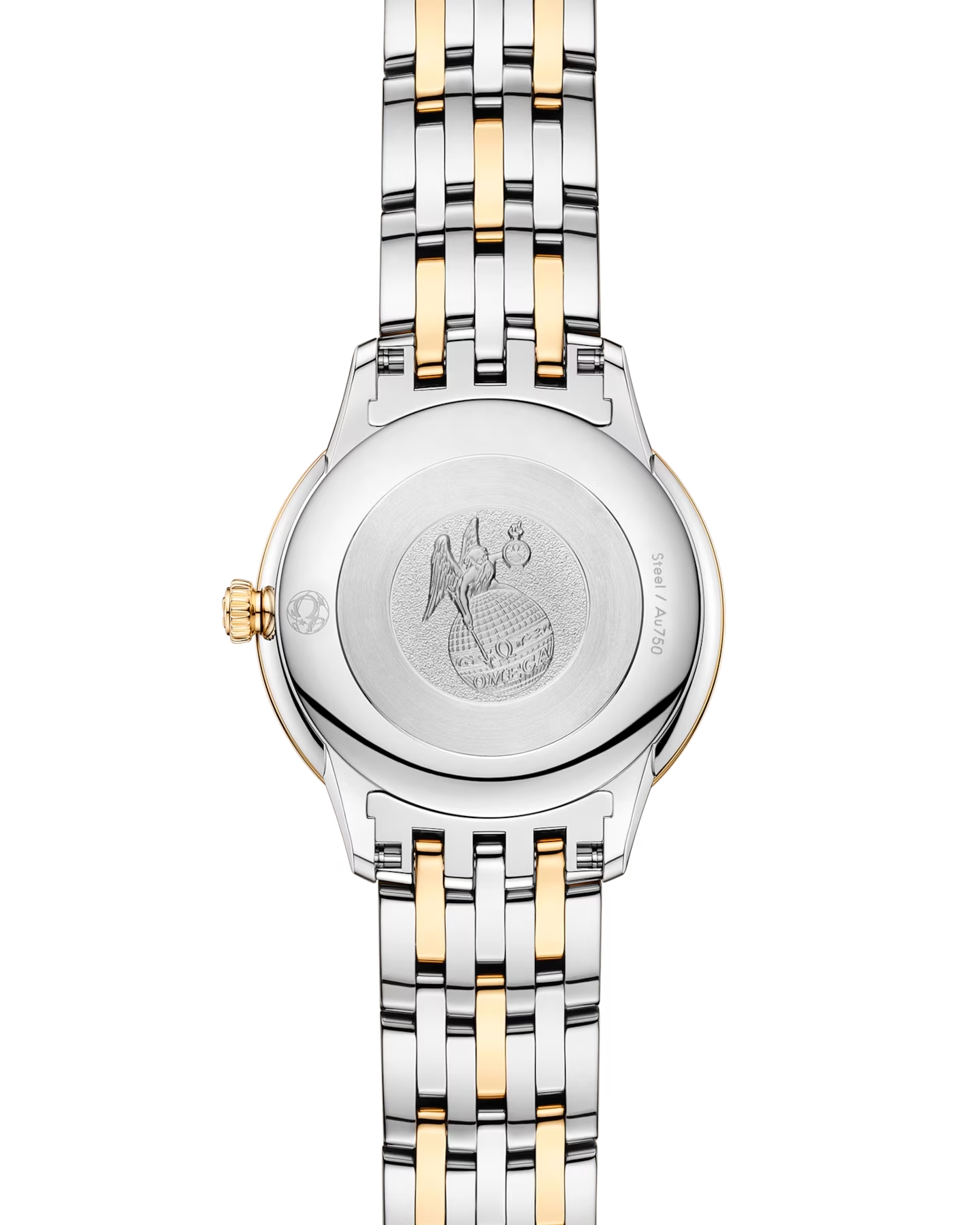 この直径27.5mmのステンレススティール&18Kイエローゴールド製モデルは、ホワイト マザーオブパールのダイアルを備えています。また、イエローゴールド仕上げの針と、ローマ数字とカボションカットのインデックスが交互にセットされています。このタイムピースのシンプルな外観は、ケースバック全体にエンボス加工であしらわれた時の神クロノスのメダリオンによって引き立てられています。