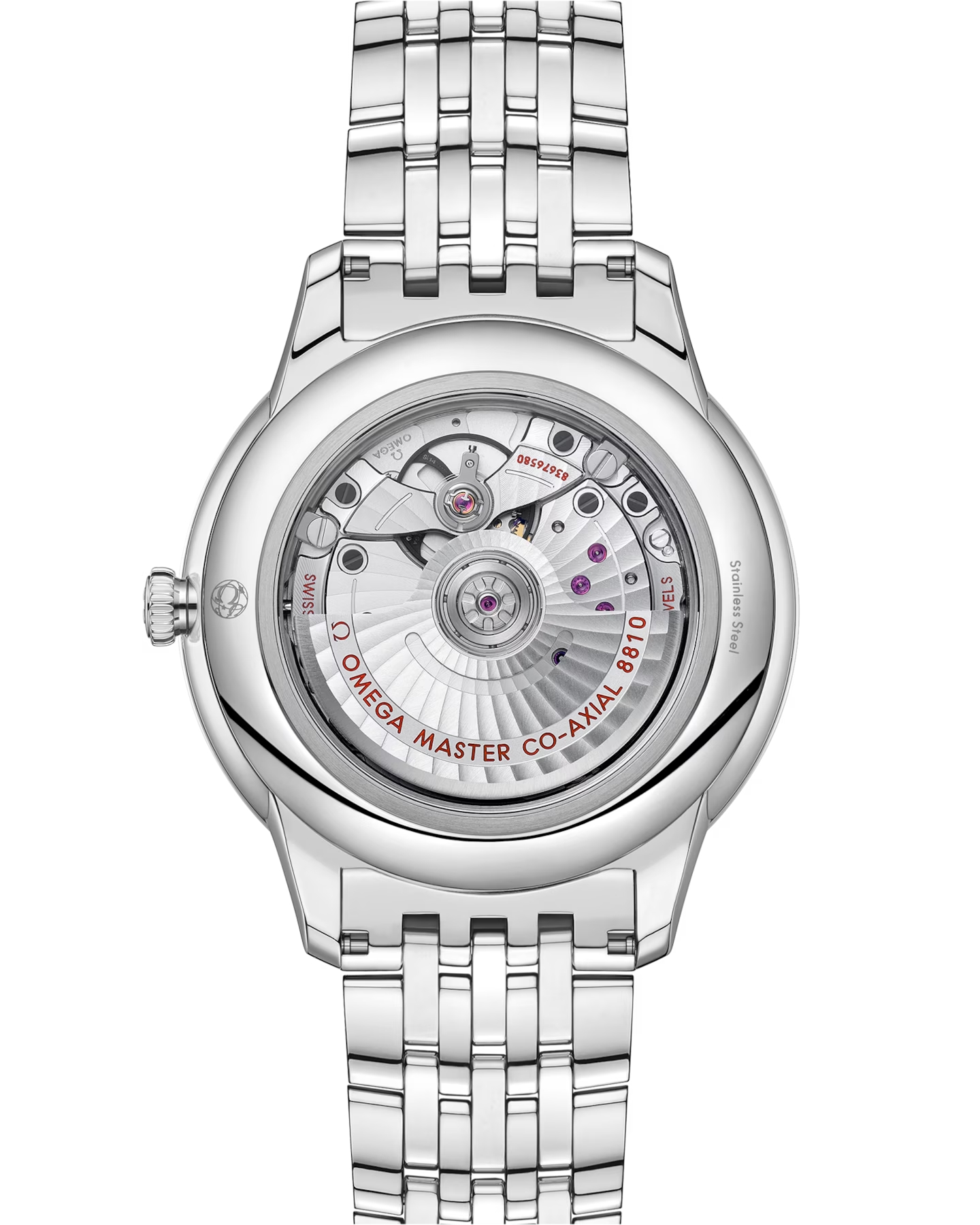マスター クロノメーター認定を取得したこの時計は、ステンレススティール製ブレスレットを備え、傷の付きにくいサファイアクリスタル製ケースバックからオメガ マスター コーアクシャル キャリバー8810を眺めることができます。